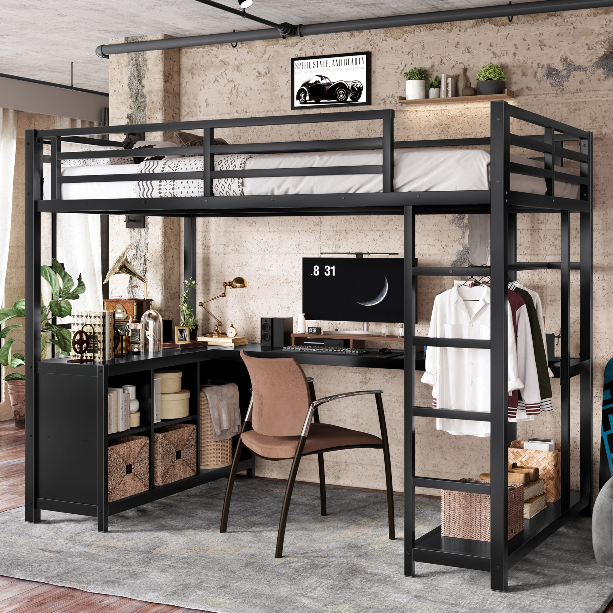 Metal Loft Bed with Wardrobe and L-shaped Desk, Twin XL Size Loft Bed with Storage Cubes and Shelves