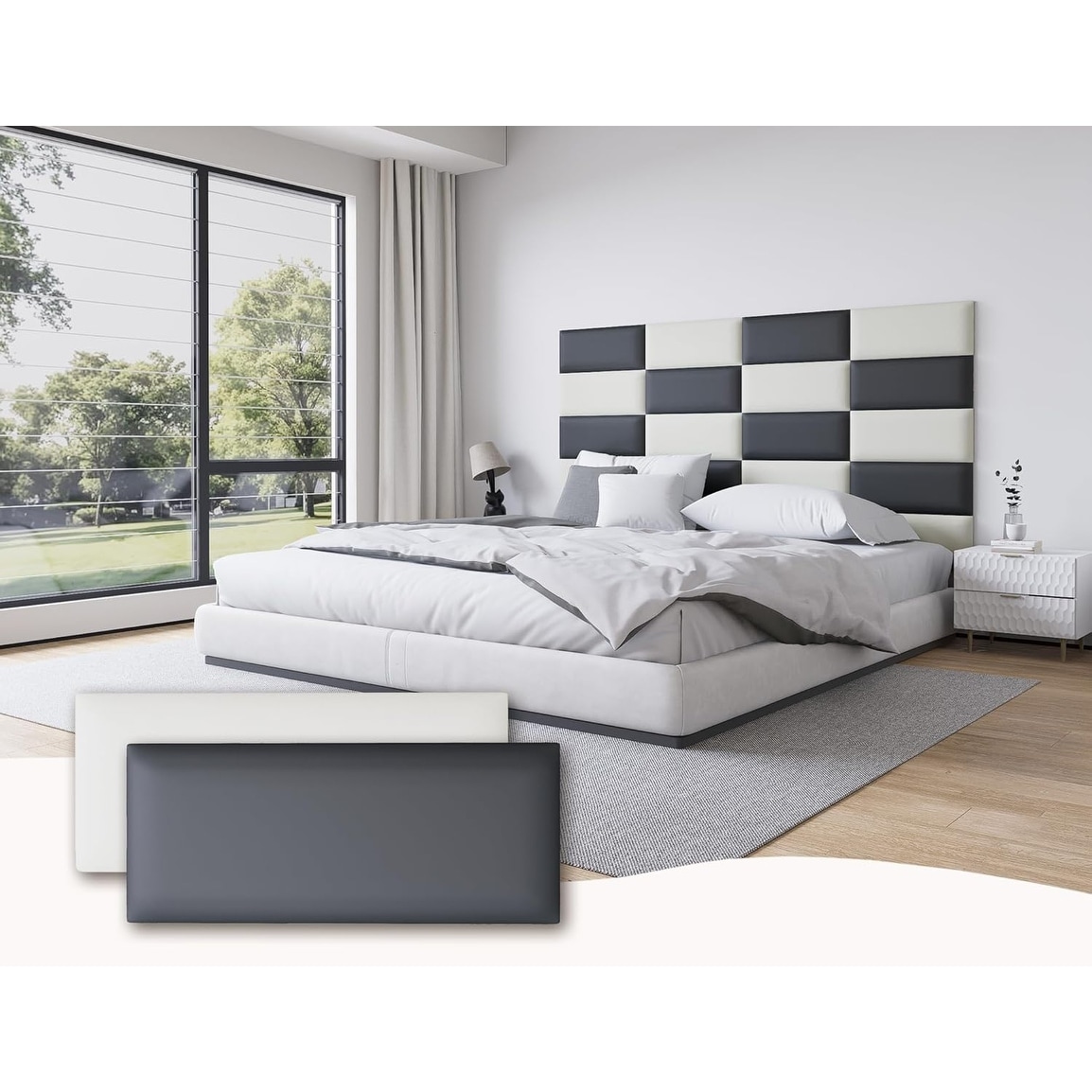 Leather Black and White Upholstered Queen Headboard, 12PCS Peel and Stick Wall Panels