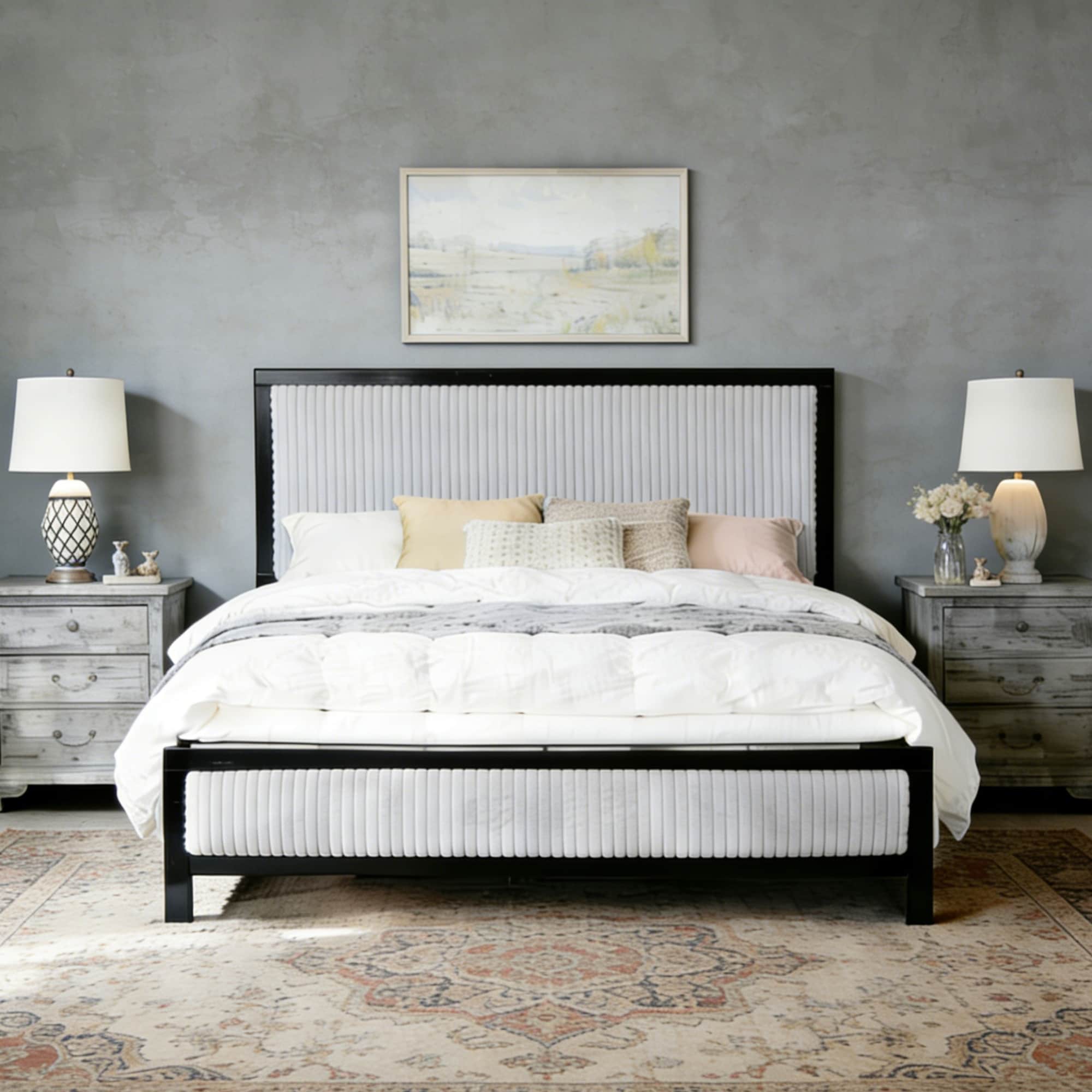 Roomfitters Upholstered Platform Bed Frame with Plush Cloud-Like Headboard and Solid Wood Slats, Grey and Black