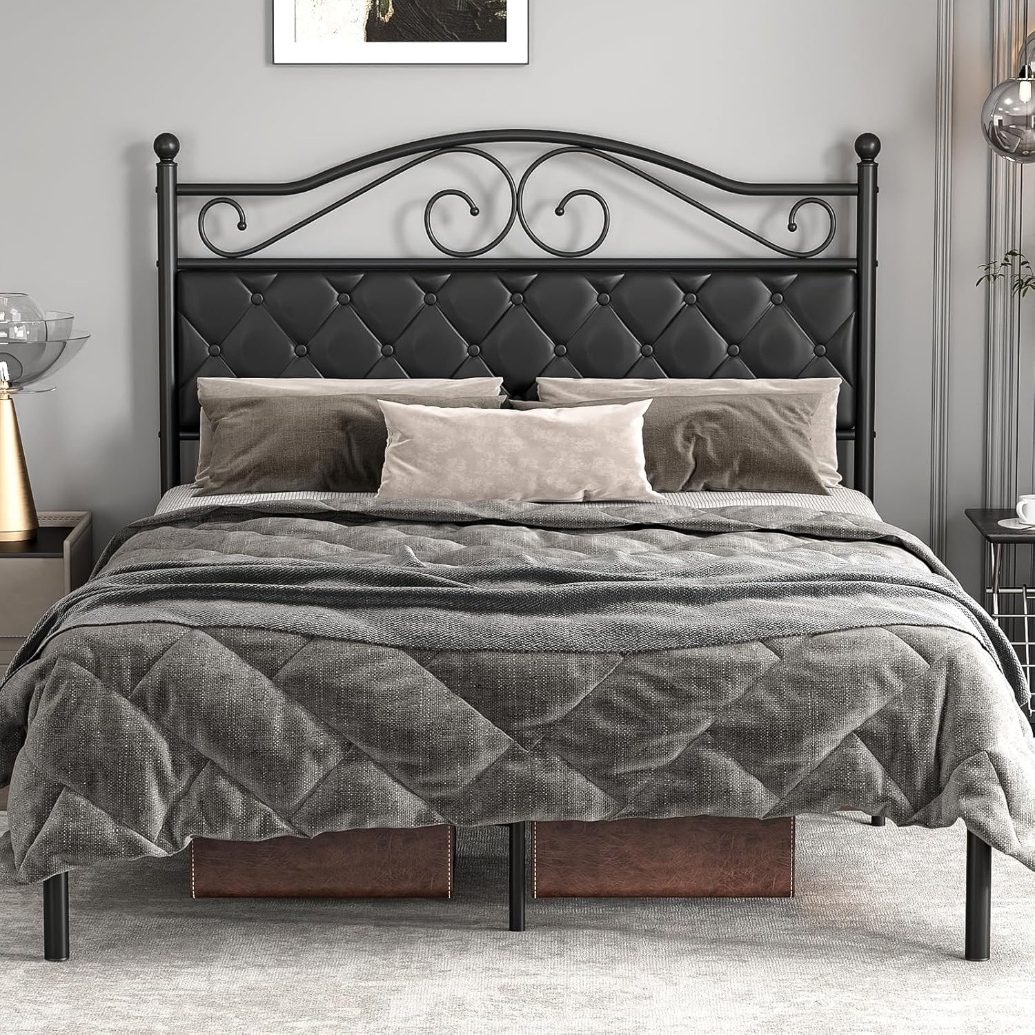 Full Bed Frame with Upholstered Headboard, Metal Platform with Storage Space, Black