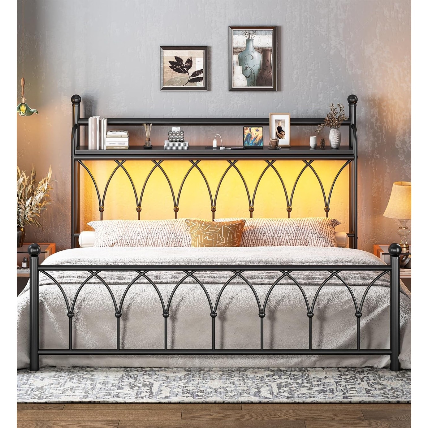 Queen Size Bed Frame With Charging Station Upholstered Headboard Metal Platform