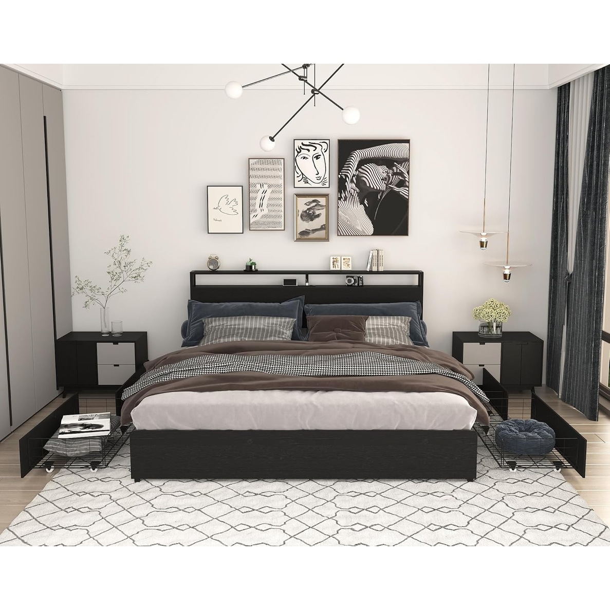 King Size Bed Frame with LED Headboard, Charging Station, and 4 Storage Drawers, No Box Spring Needed, Easy Assembly