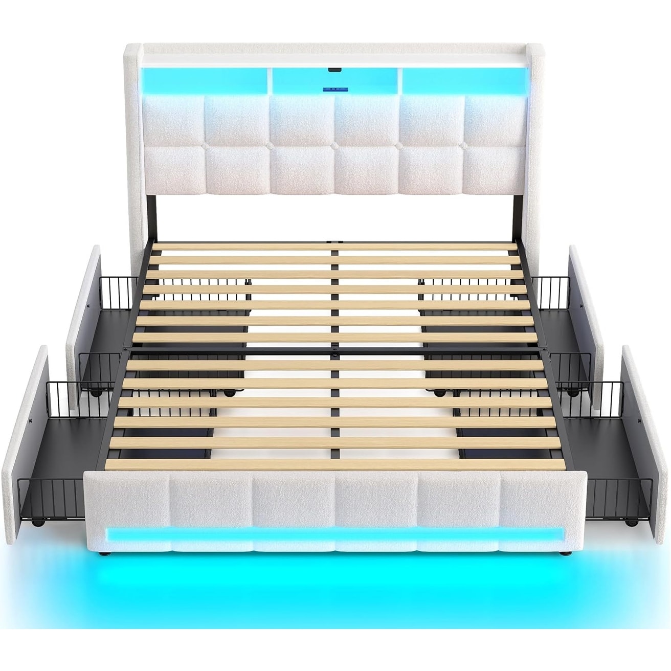 Full Size Bed Frame with LED Lights, Charging Station, Storage Headboard & Drawers, Easy Assembly, White