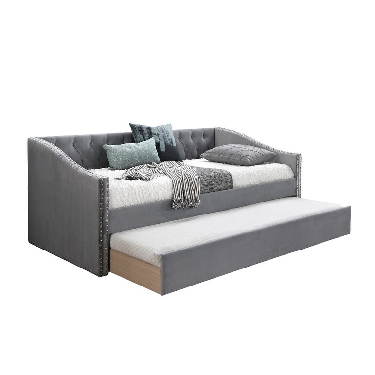 Day Bed With Trundle Button Tufted Nailhead Trim Gray Finish Slat Included