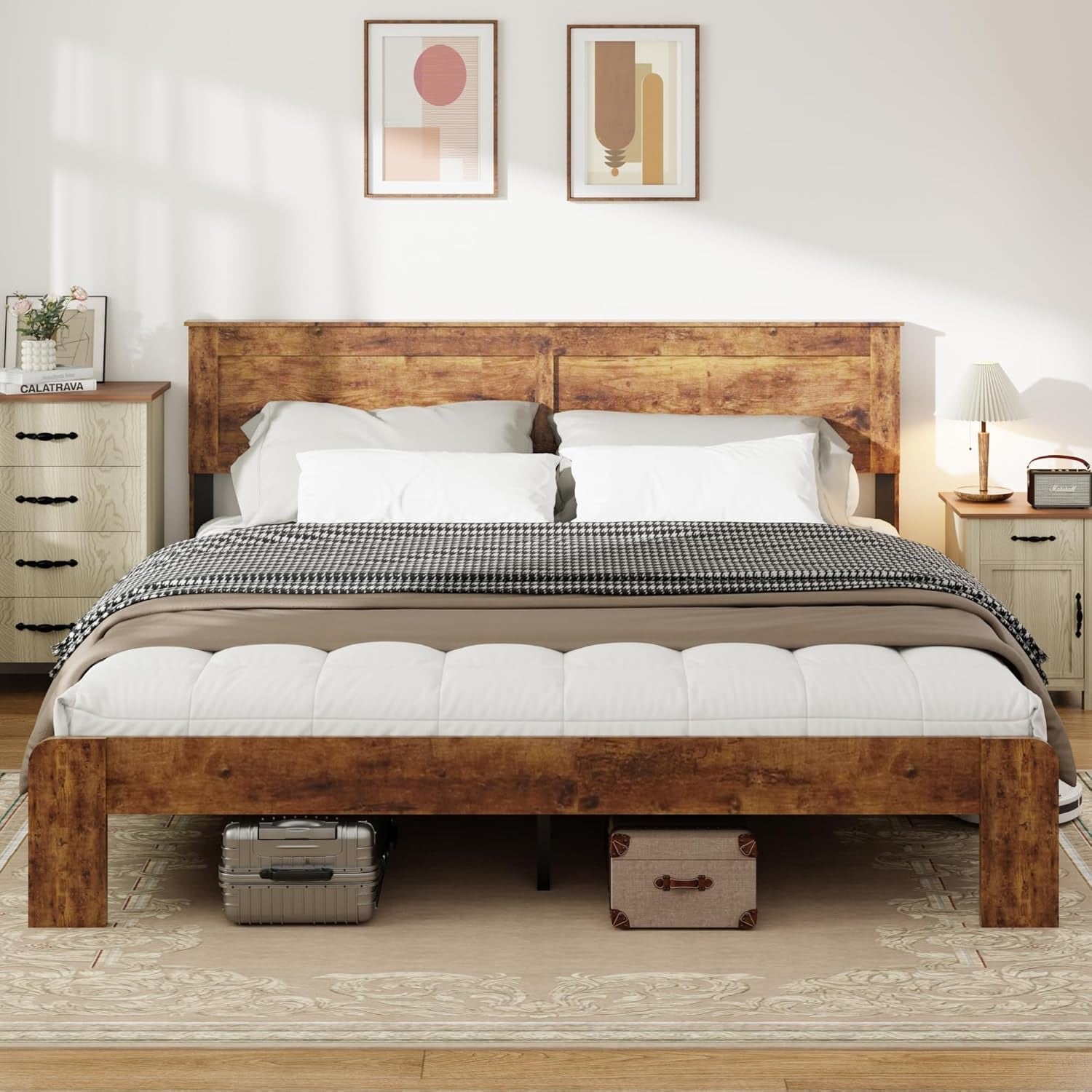 Rustic Industrial King Size Wooden Bed Frame with Headboard, Sturdy Wood Slats, Noise Free, Easy Assembly, Brown
