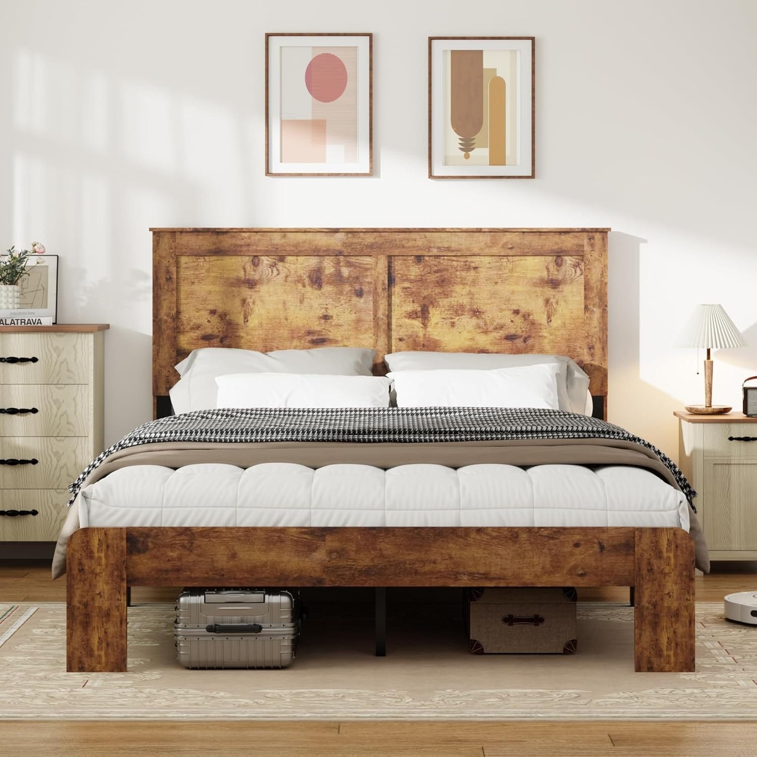 Full Size Rustic Industrial Wooden Bed Frame with Headboard, Sturdy Support, Noise Free, Easy Assembly, Brown