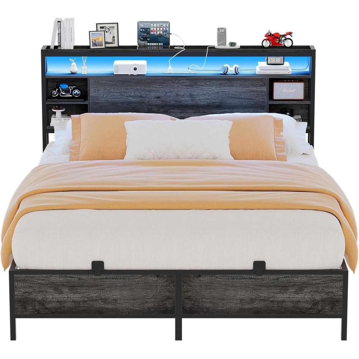 Twin Size Bed Frame with Charging Station, RGB LED Light, Storage Headboard, and Sturdy Metal Slats, Easy Assembly, Black Oak