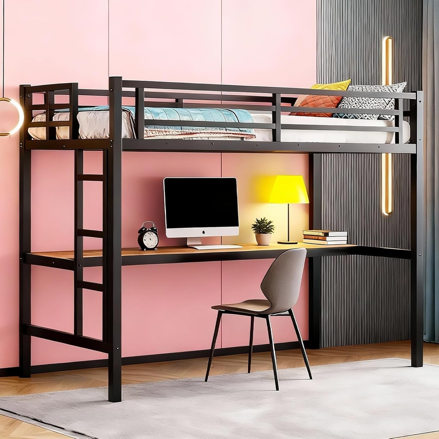 Full Size Metal Loft Bed with Desk, LED Lights & USB Charging Station, Space-Saving Bed Frame for Adults, Kids, Teens, Black