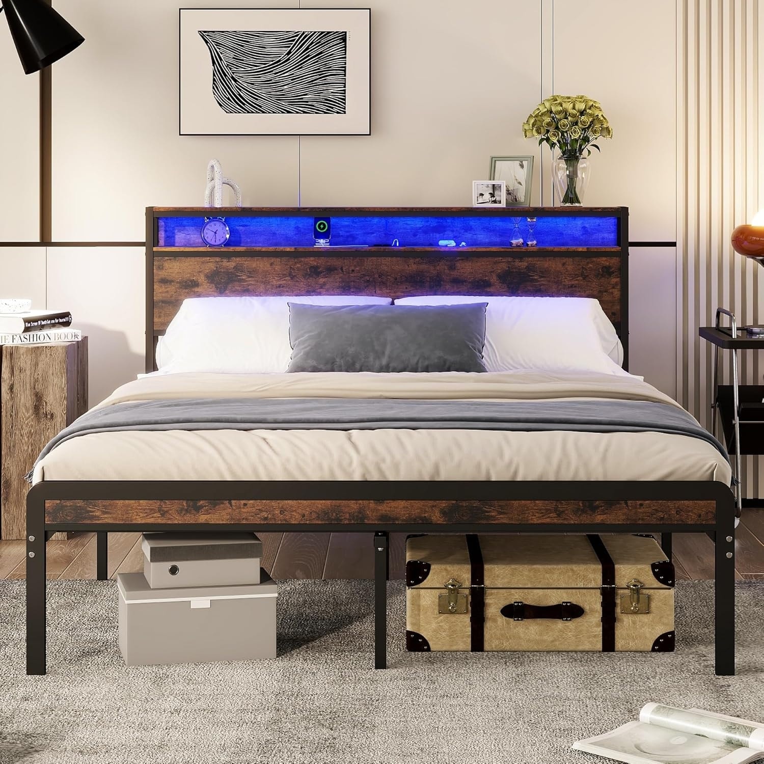 Full Size Bed Frame with Headboard, Charging Station, LED Lights, Rustic Brown, No Box Spring Needed