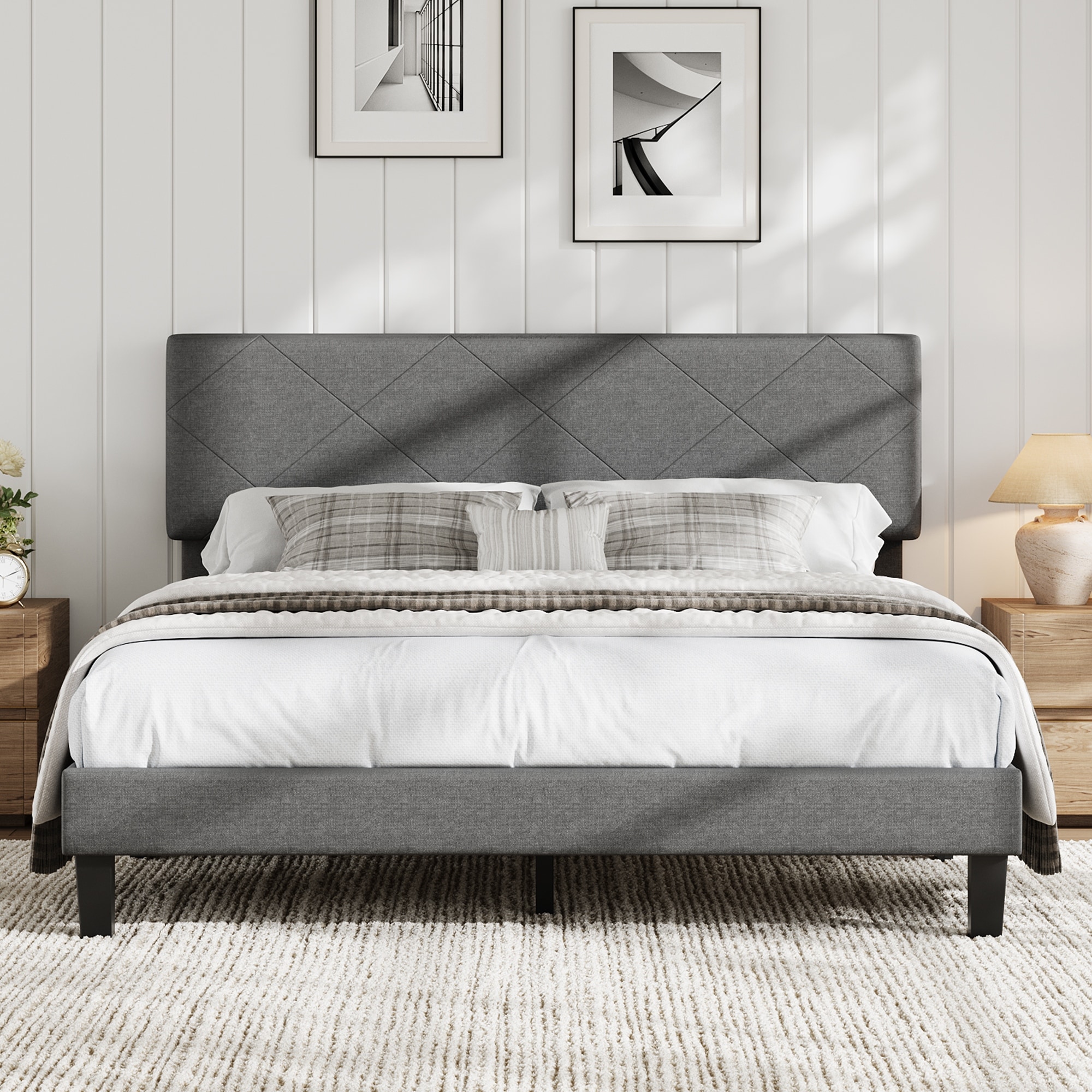 Bed Frame with Upholstered Headboard, Platform Bed Frame with Wooden Slat Support