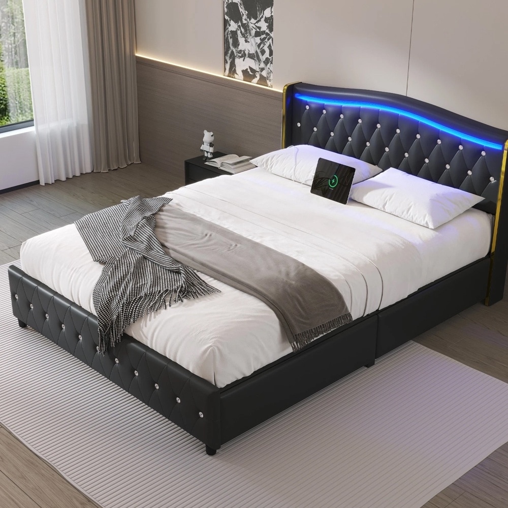 Upholstered Bed Frame with Storage Drawers Built-In USB Ports Full