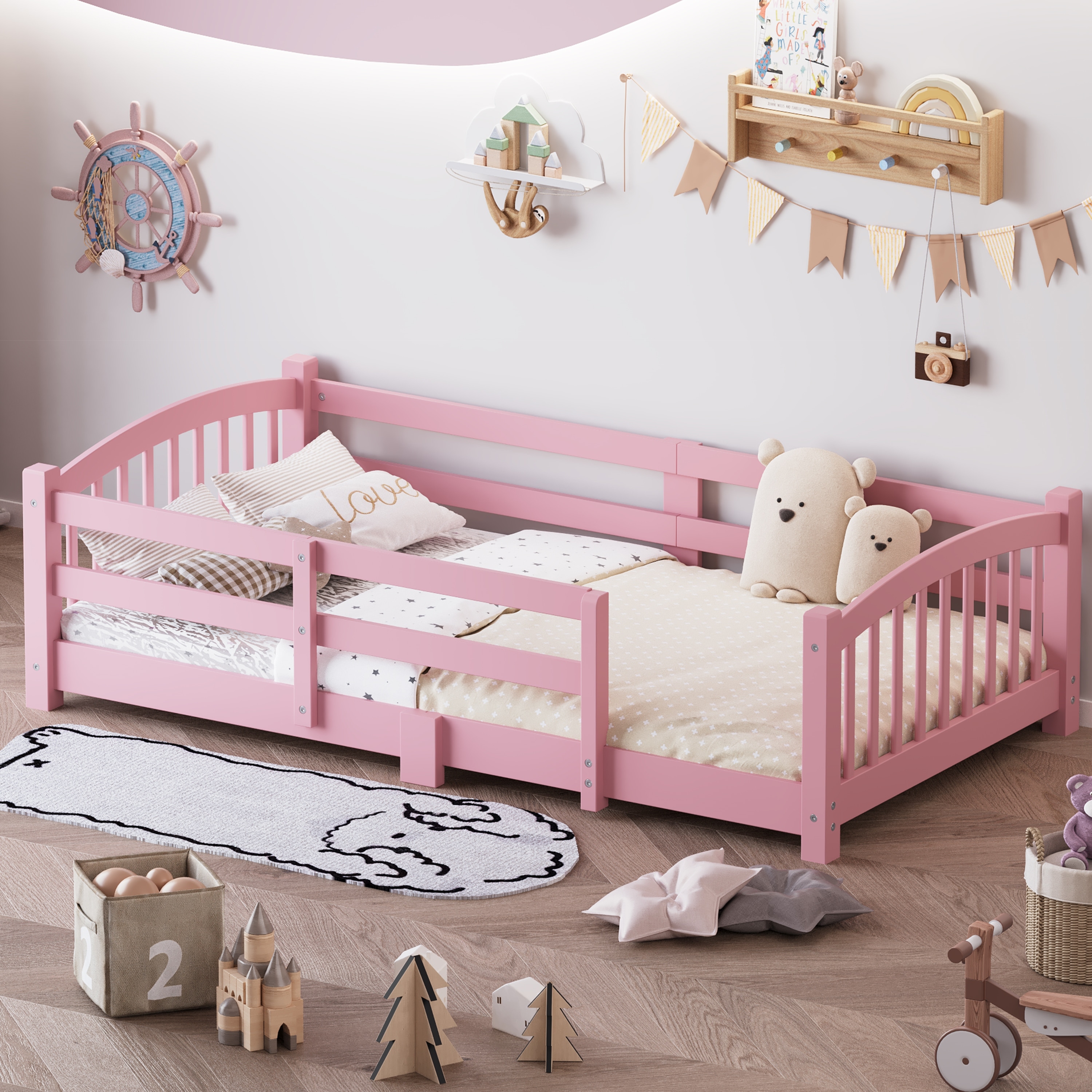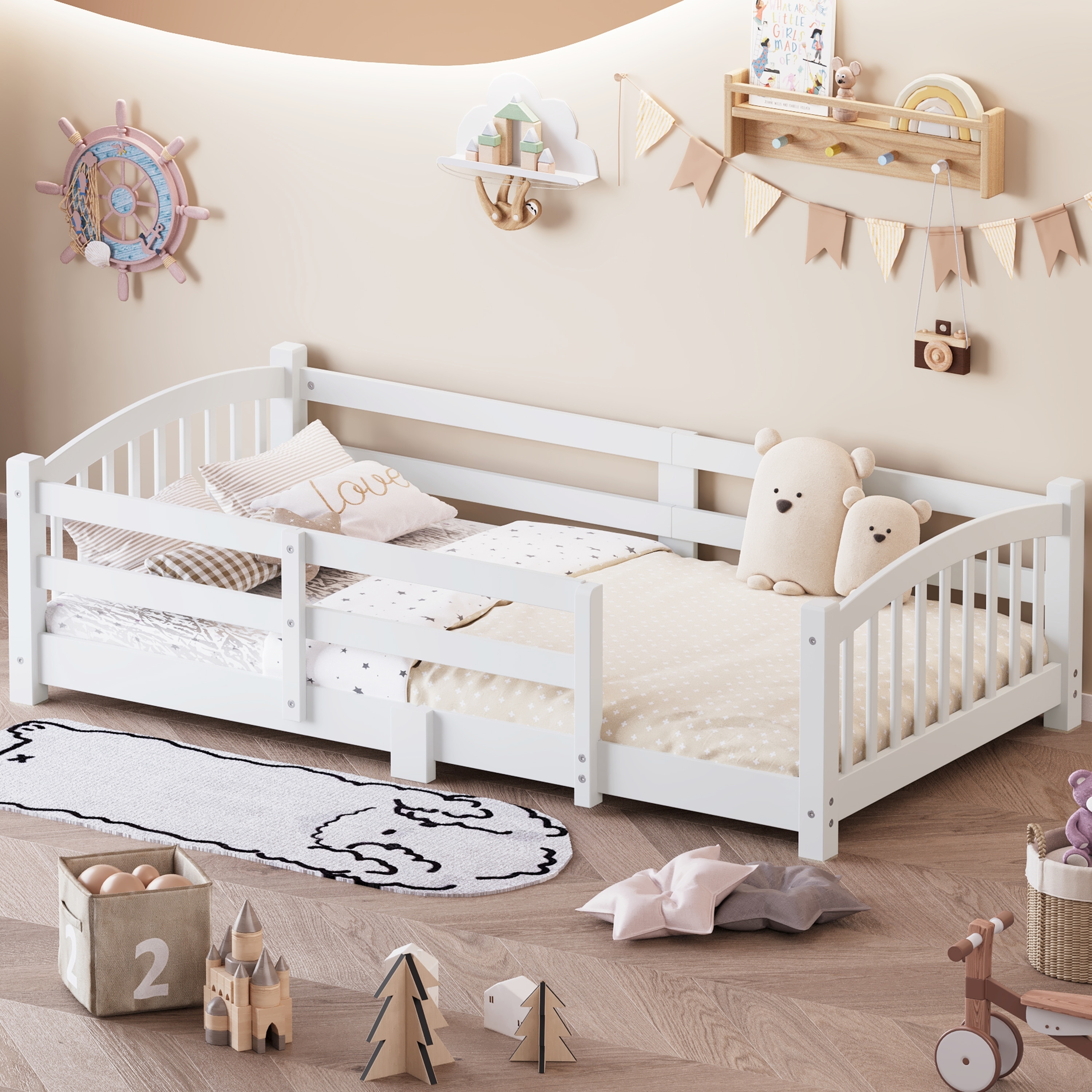 Roomfitters Montessori Floor Bed with Guardrails, Solid Wood Low Platform Bed with Slats, Easy Assembly