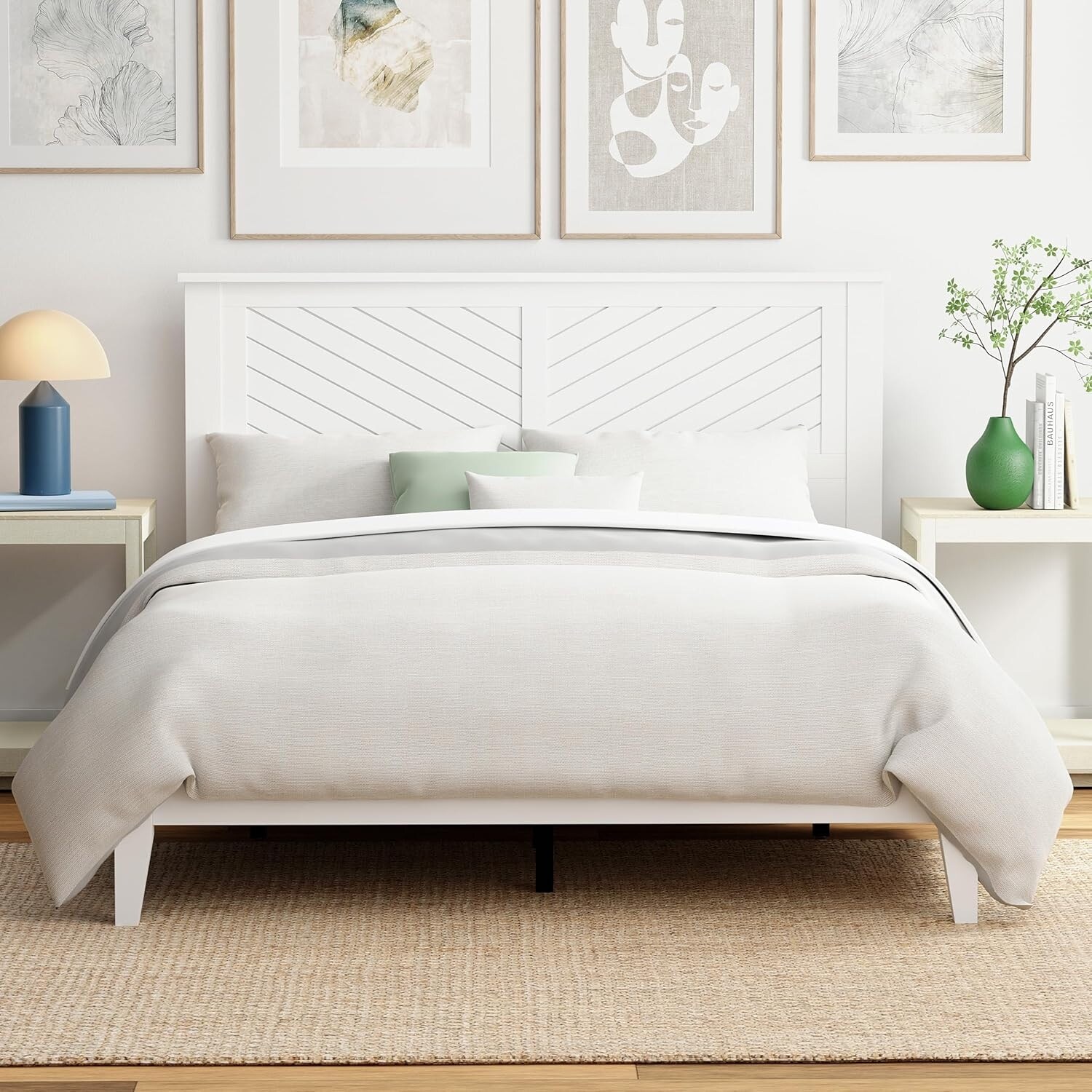 Queen Size Wood Bed with Chevron Headboard, Coastal Modern Design, Easy Assembly, Underbed Storage, White Finish