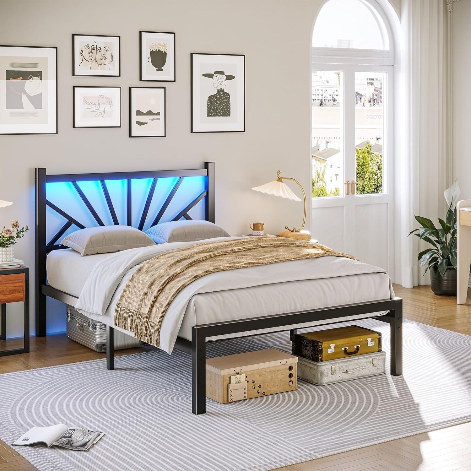 White Floating Queen Bed Frame with LED Lights, Heavy Duty Steel Slats, Noise-Free, Easy Assembly