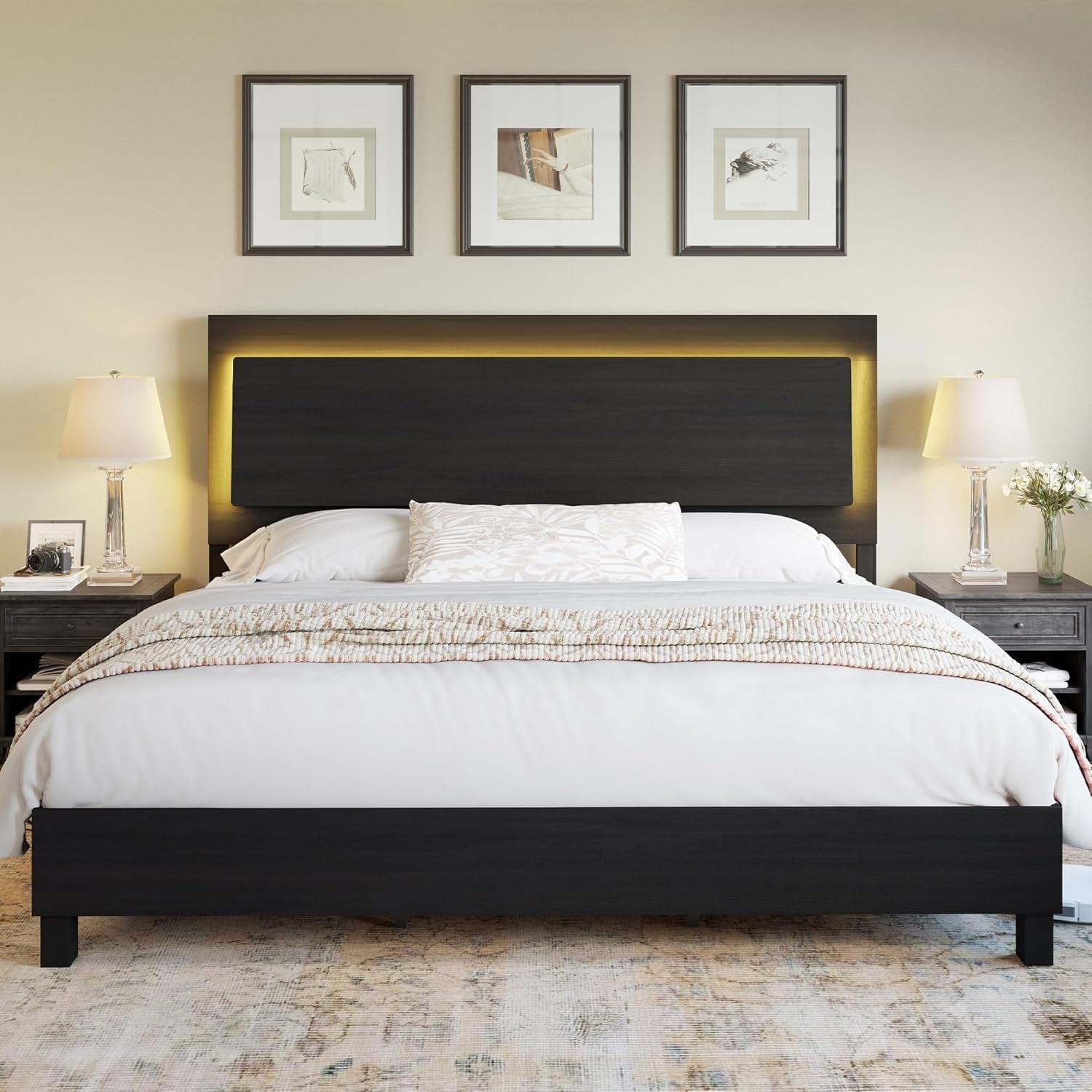Queen Bed Frame with LED Headboard, Rustic Platform Bed, Noise Free, Black