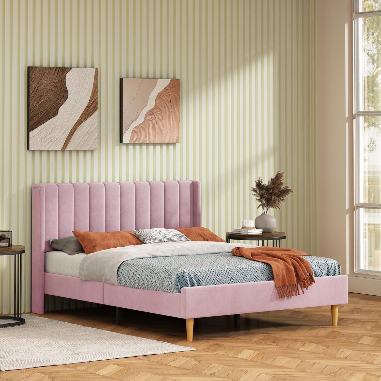 Velvet Upholstered Full Size Platform Bed with Tufted Wingback Headboard, Wooden Slats, Noise-Free, Easy Assembly, Pink