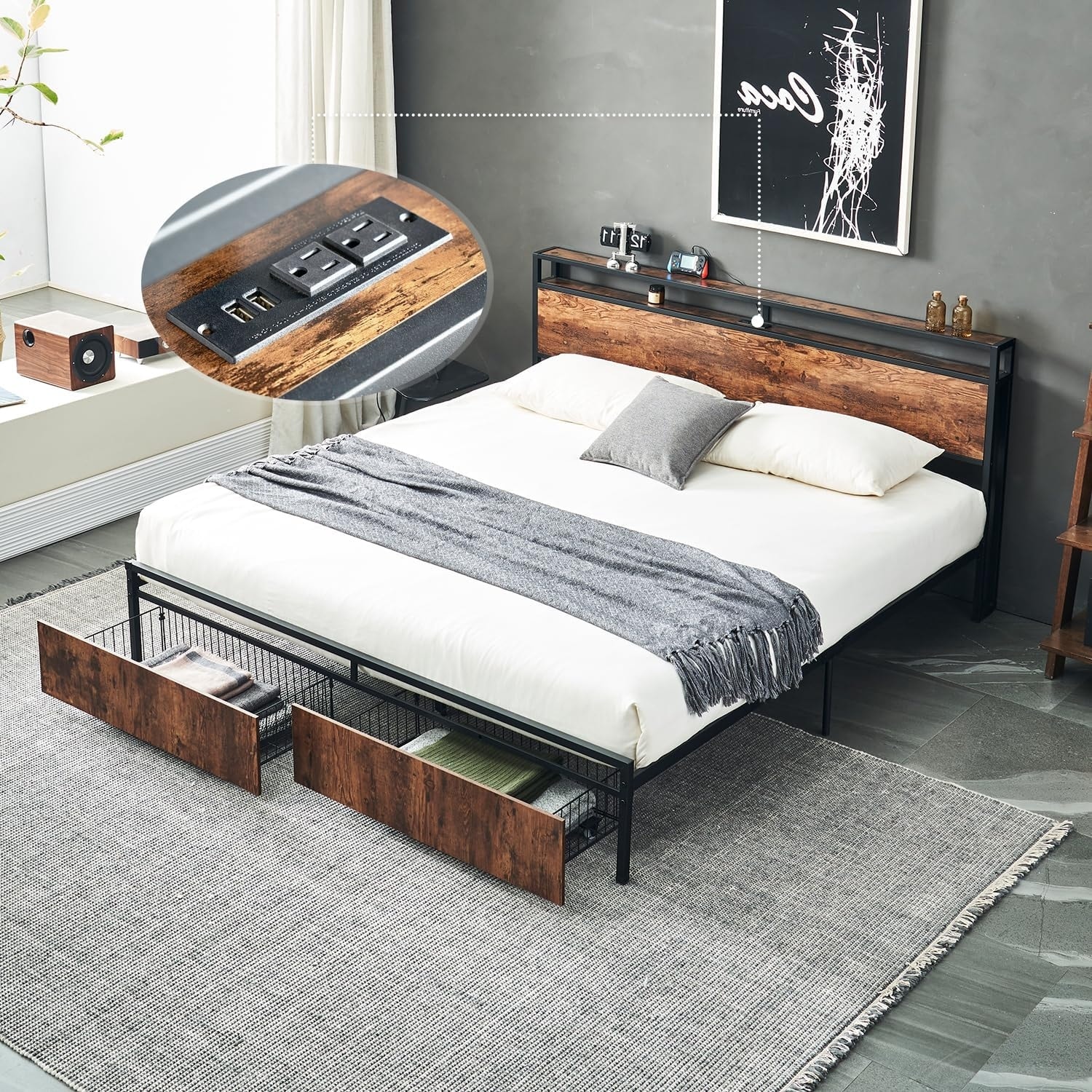 King Size Metal Bed Frame with Headboard, Storage Drawers, Charging Station, Easy Assembly, No Box Spring Needed