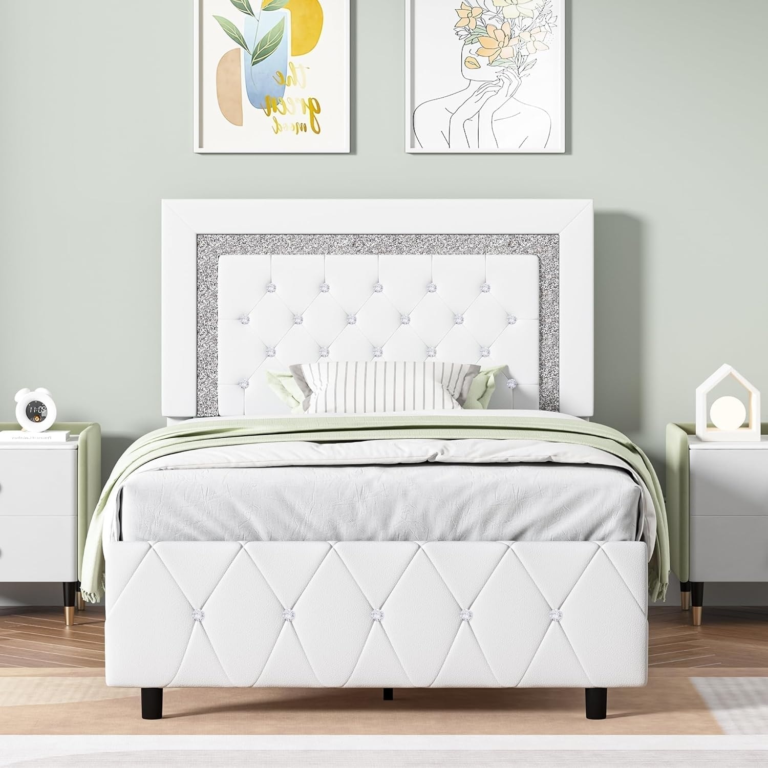 Twin Size Upholstered Platform Bed with Button Tufted Headboard, Diamond Design, Wooden Slats, Easy Assembly, White