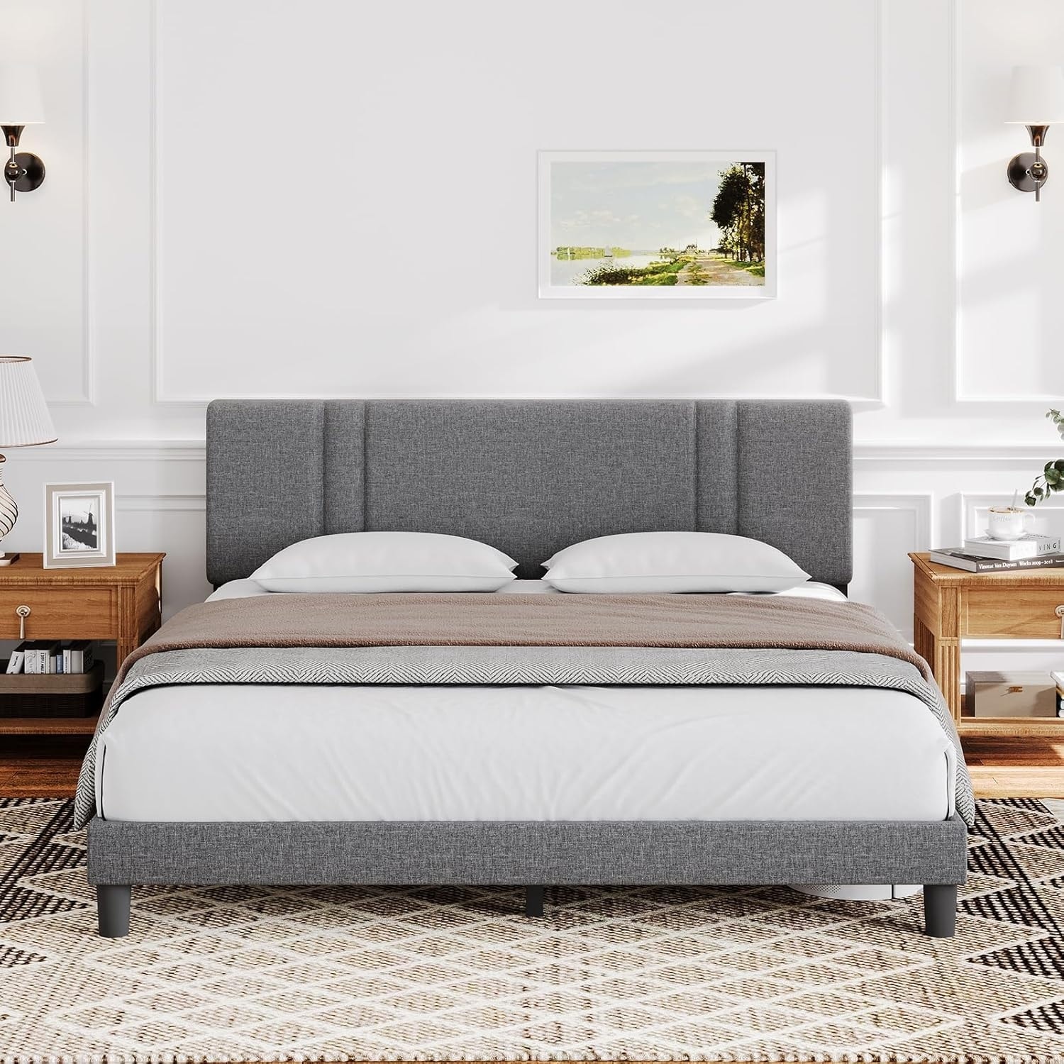 Queen Size Bed Frame with Adjustable Linen Headboard, Wood Slats, No Box Spring Needed, Easy Assembly, Light Grey
