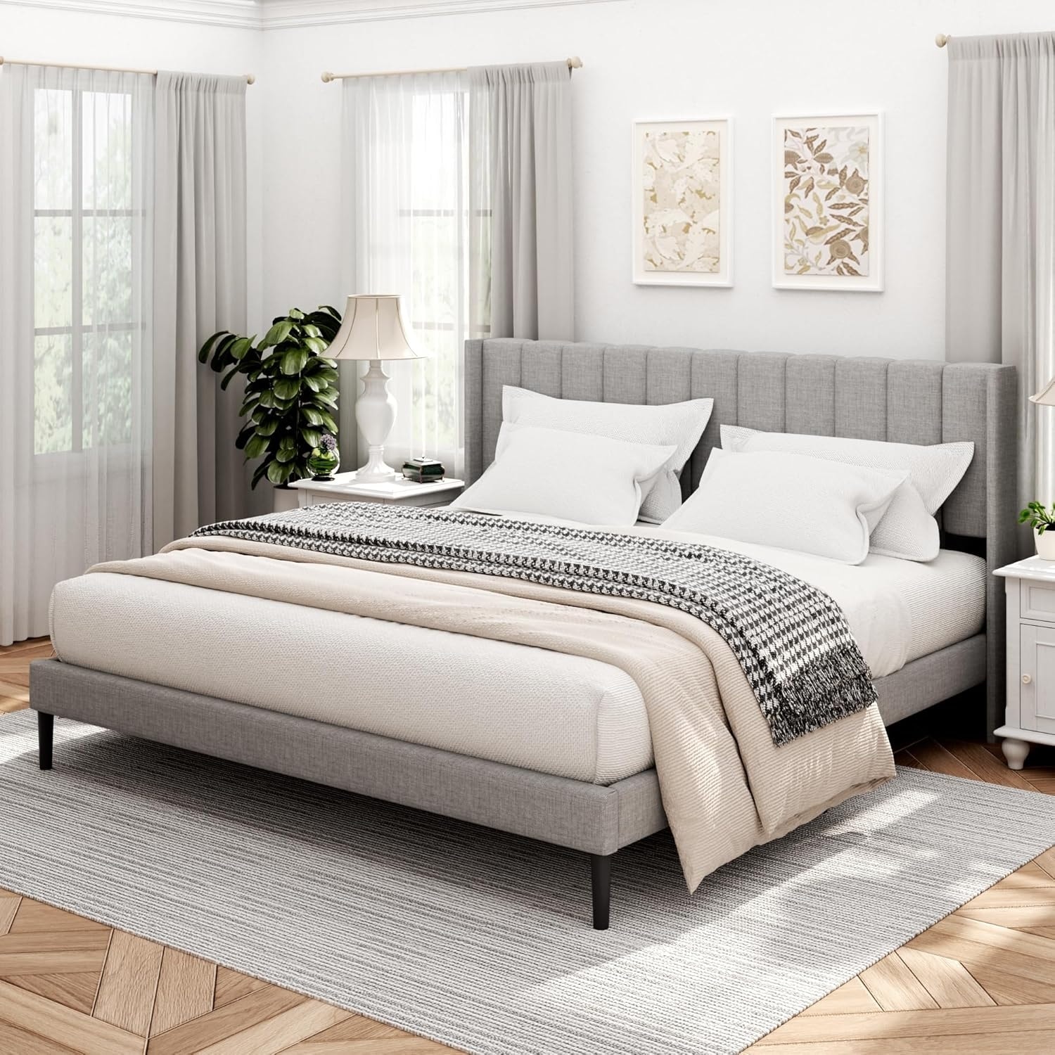 Queen Size Bed Frame with Vertical Channel Tufted Headboard, Light Grey Linen, Easy Assembly, No Box Spring Needed