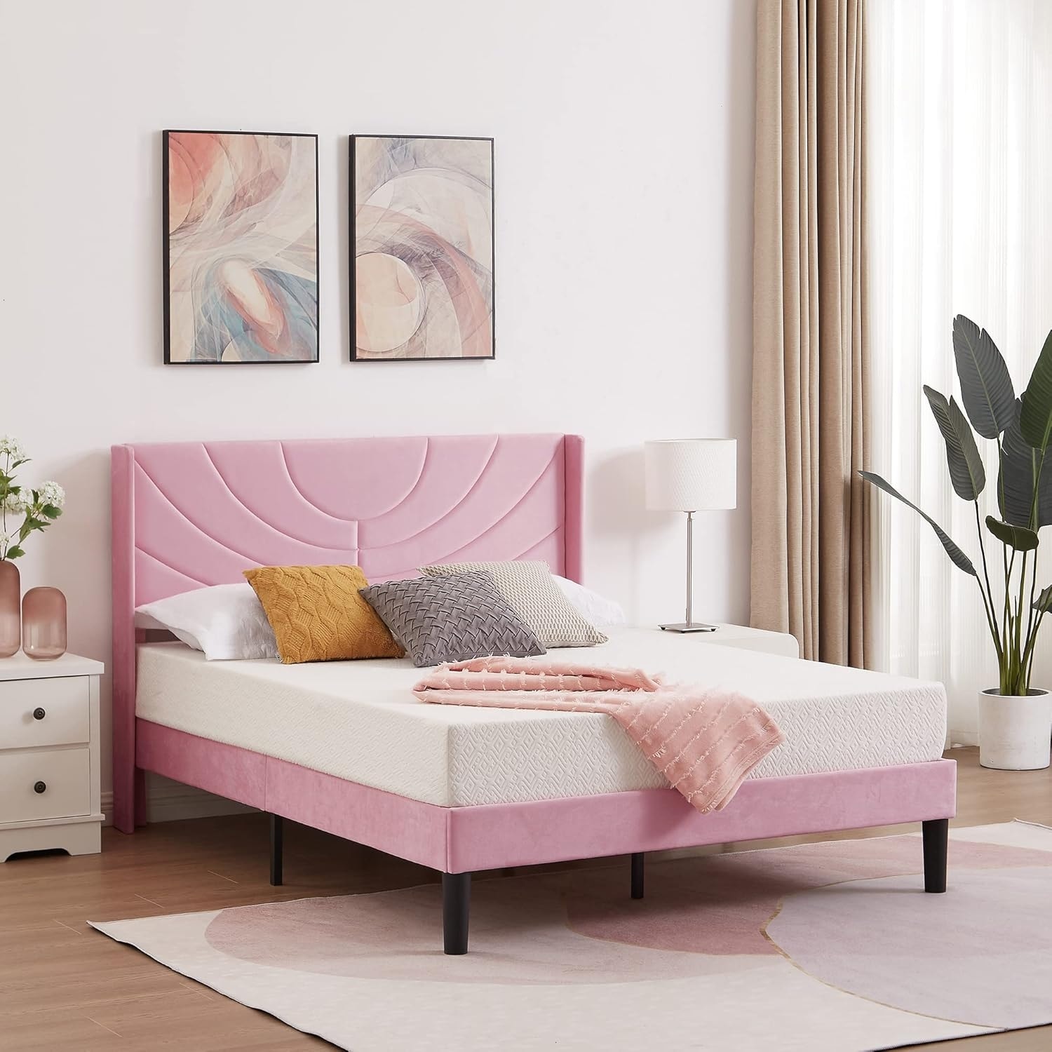 Full Size Upholstered Platform Bed Frame with Fabric Headboard, Wooden Slats, Easy Assembly, Pink