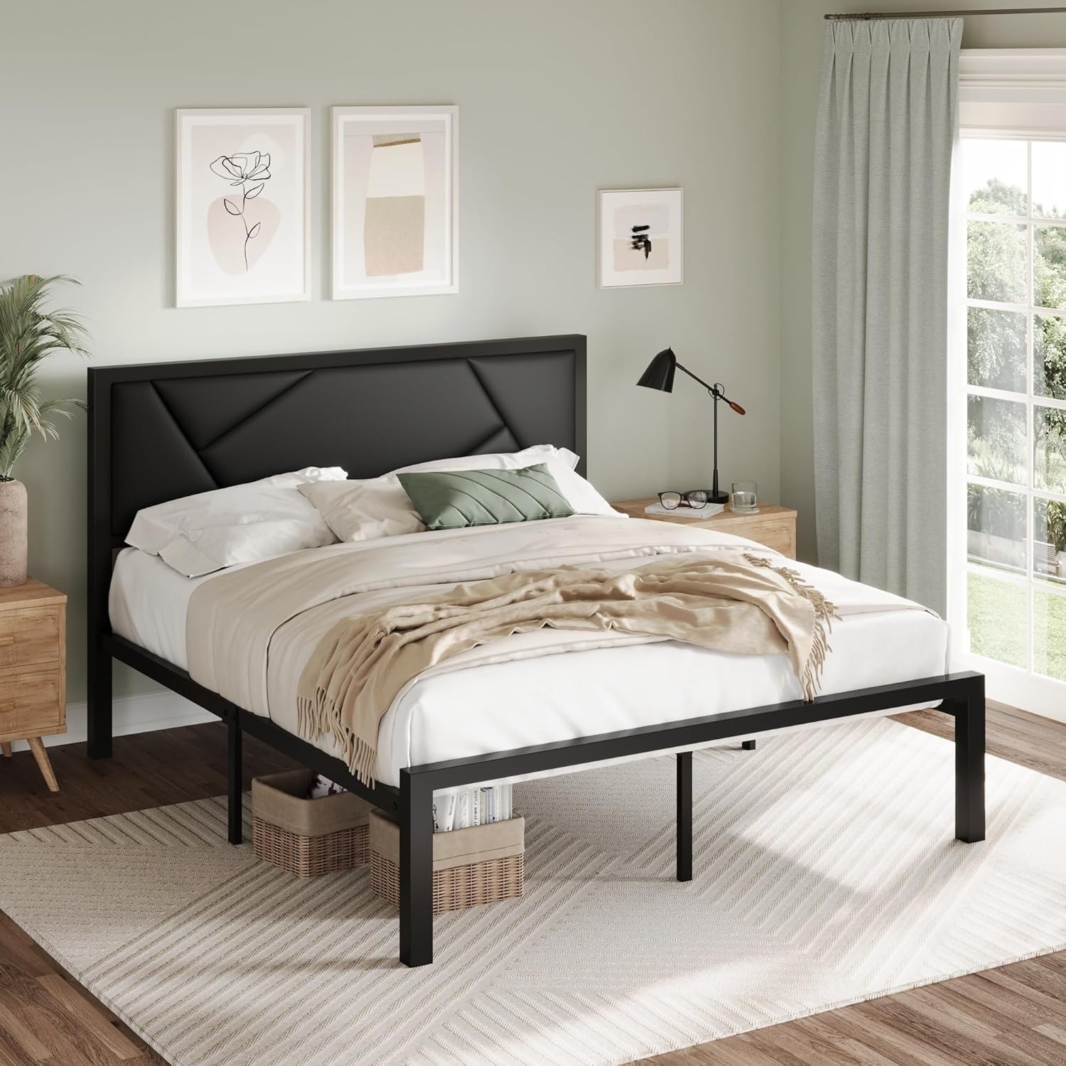 Queen Size Bed Frame with Leather Headboard, Heavy Duty Metal Slats, Noise-Free Design, Easy Assembly, Underbed Storage