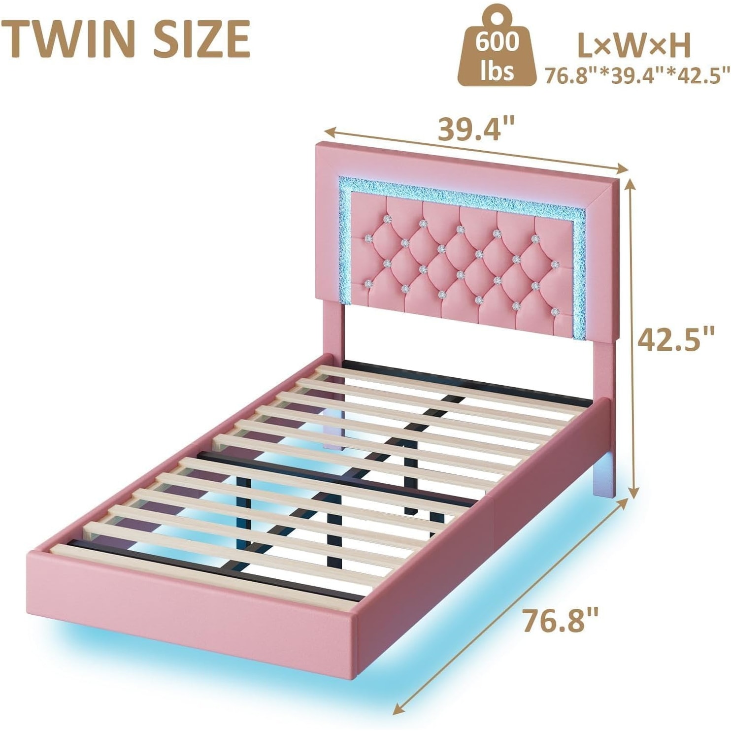 Floating Twin Bed Frame with LED Lights, Upholstered Platform, Diamond Tufted Headboard, Noise-Free, Easy Assembly, Pink