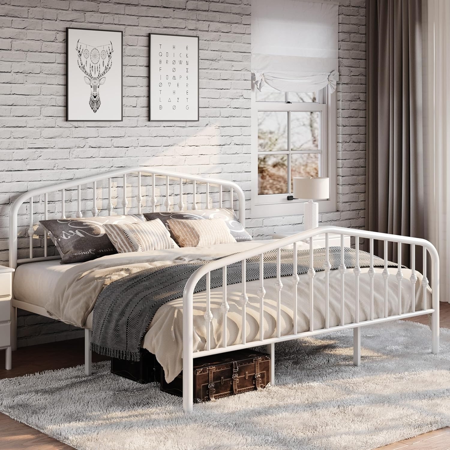 King Size Metal Platform Bed Frame with Victorian Style Wrought Iron Headboard/Footboard, No Box Spring Required, White