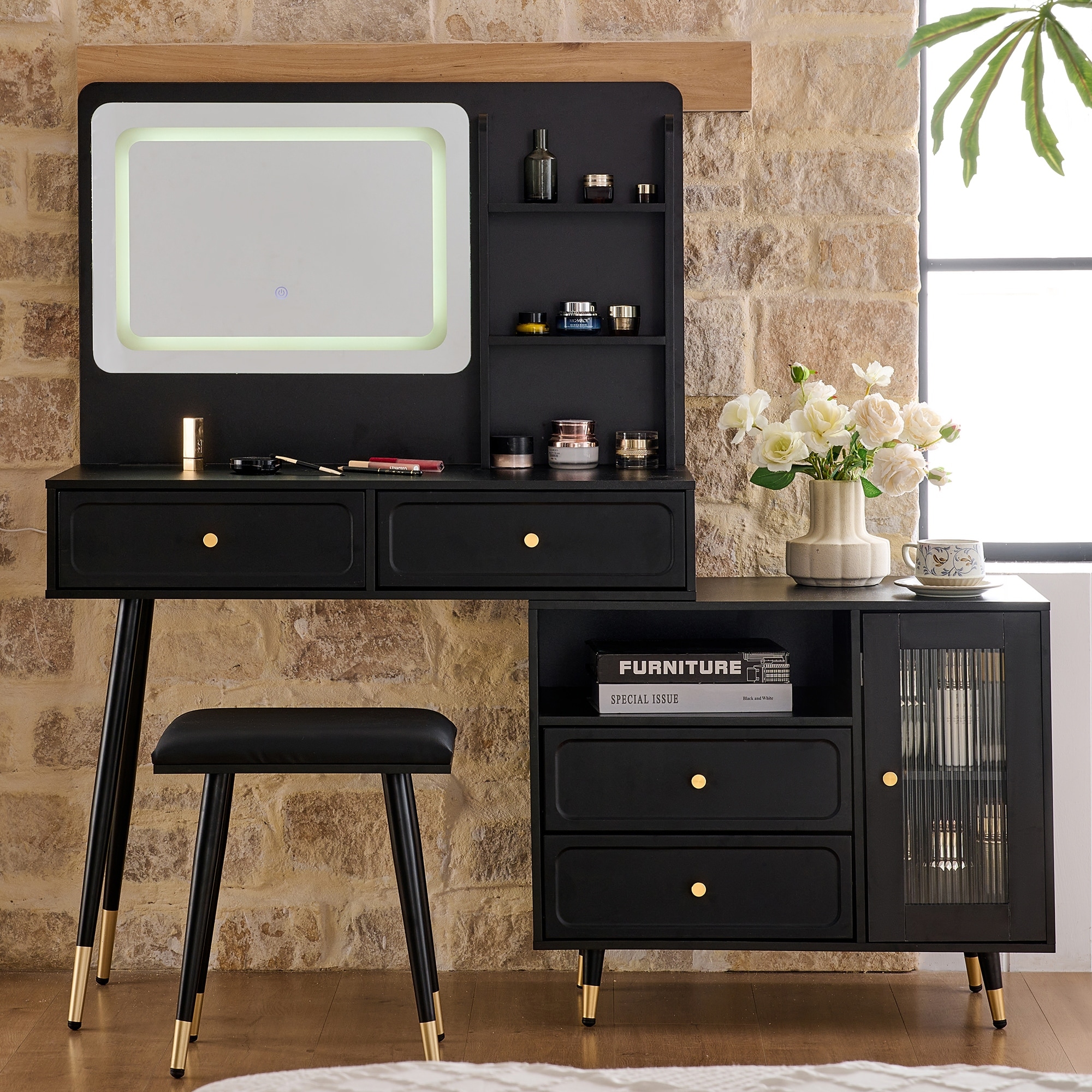 31.5" Makeup Vanity Table with LED Mirror, Stool, 5 Drawers & Extendable Table