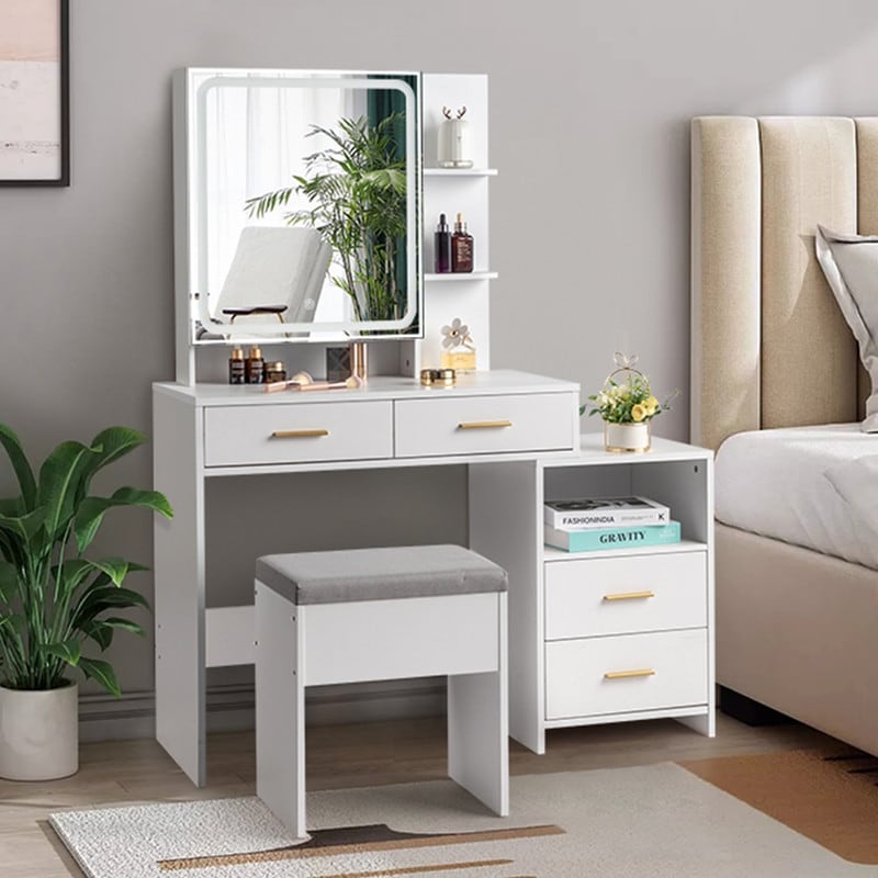 Makeup Vanity Desk with Mirror and Lights,Dressing Table Set with Charging Station and Stool,Drawers,Shelves and Side Cabinet