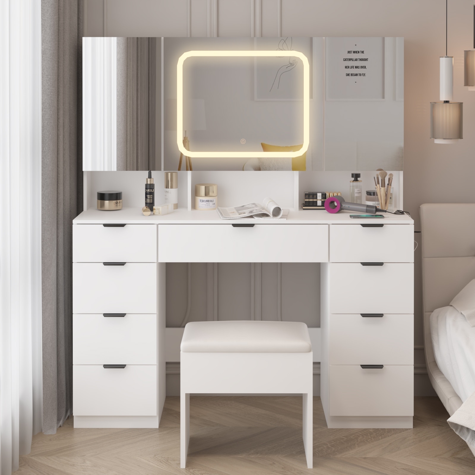 White Vanity Desk with LED Mirror and Charging Station - 3 Drawers, 7 Shelves, Storage Stool