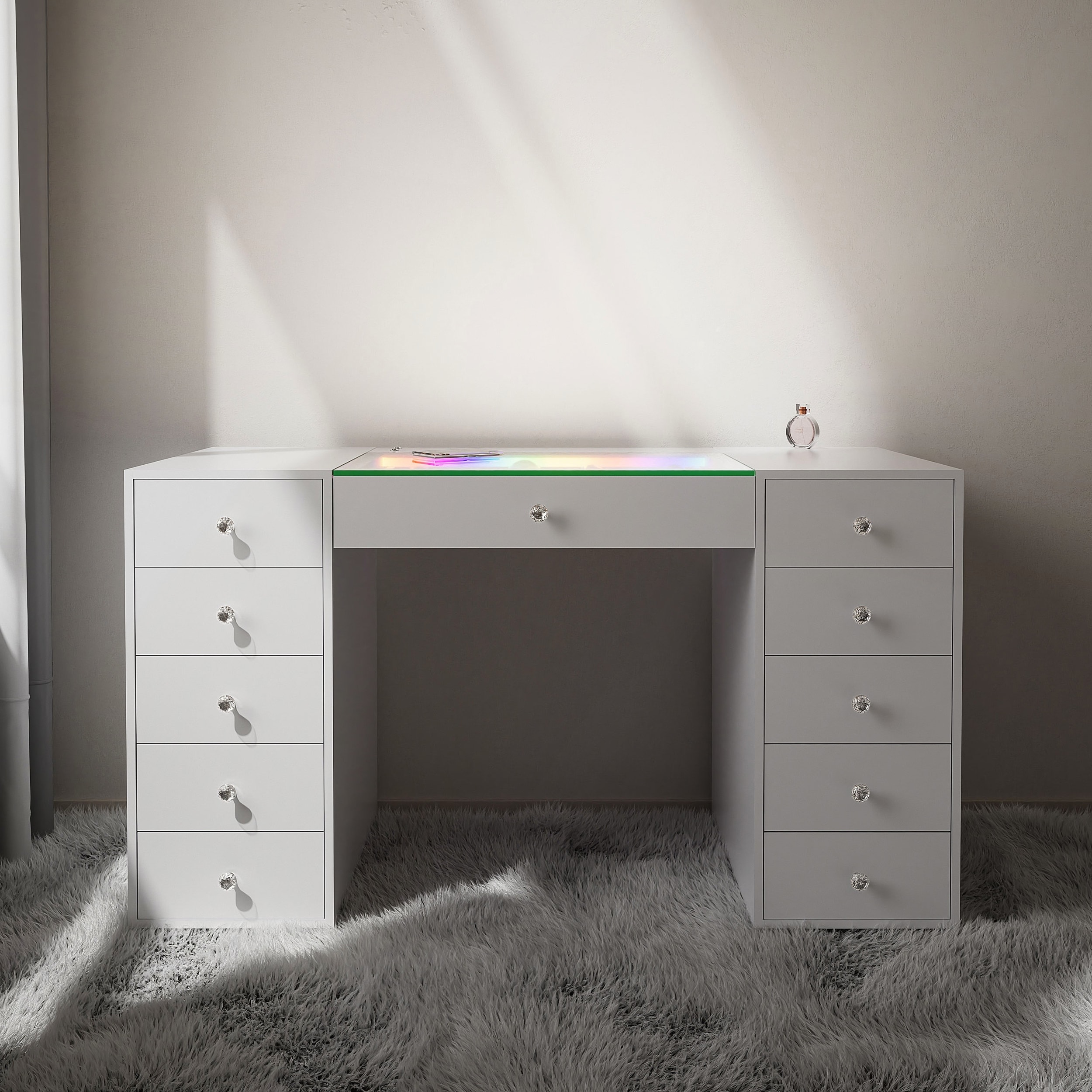 51.2 Inch Vanity Desk with RGB LED, 11 Drawers, Glass Top, 6 Lighting Modes for Modern Bedrooms