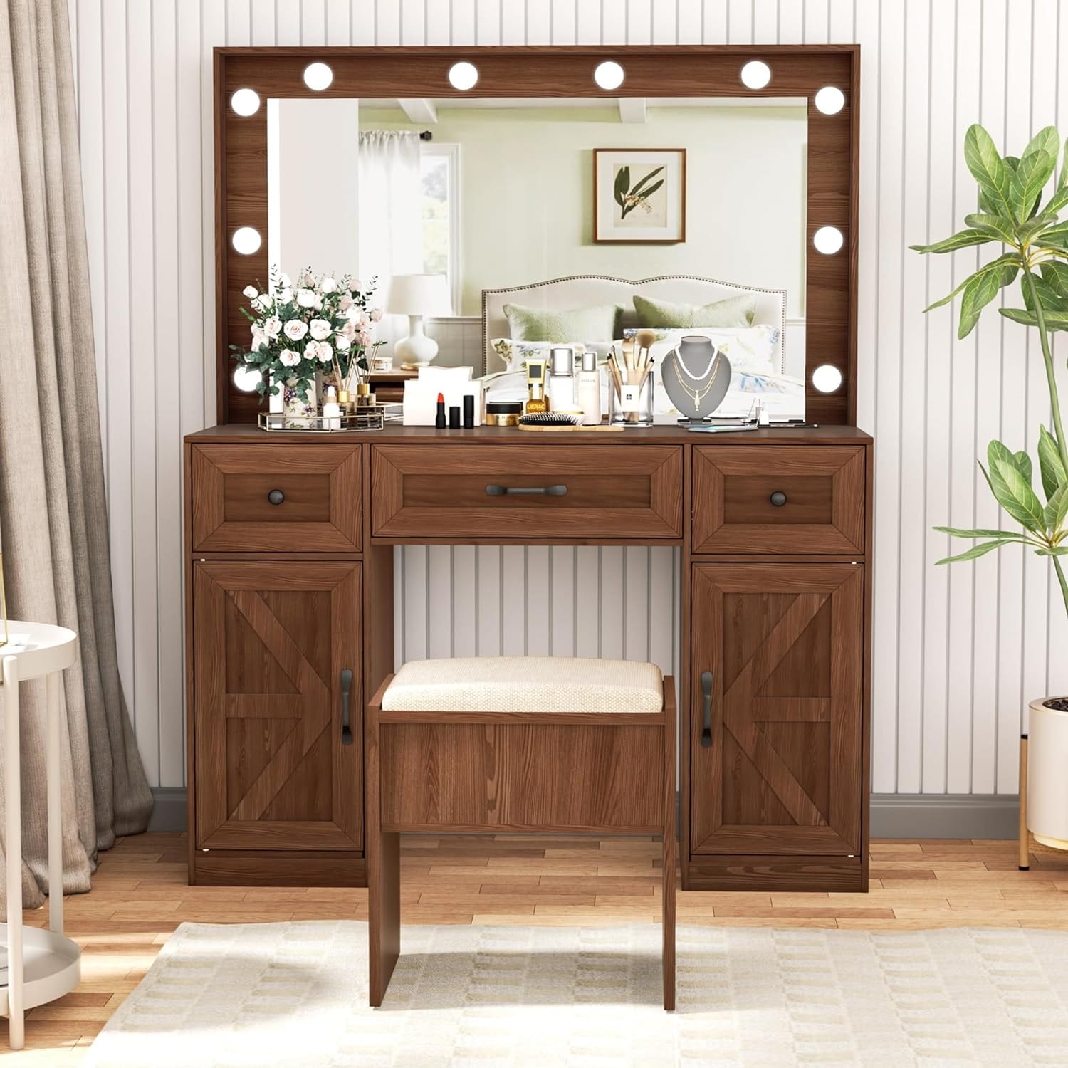 43.3'' Wide Makeup Vanity Dressing Table with Adjustable Lighted Mirror and Stool, Power Outlet