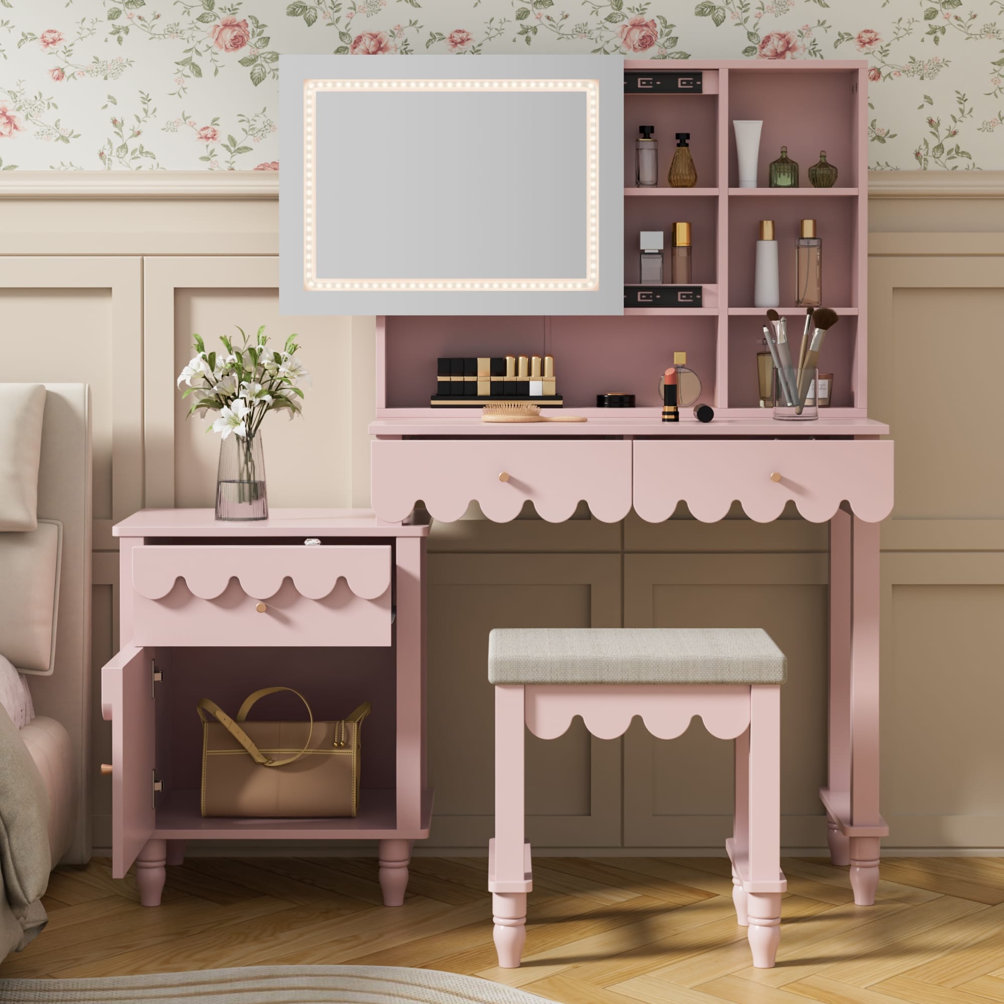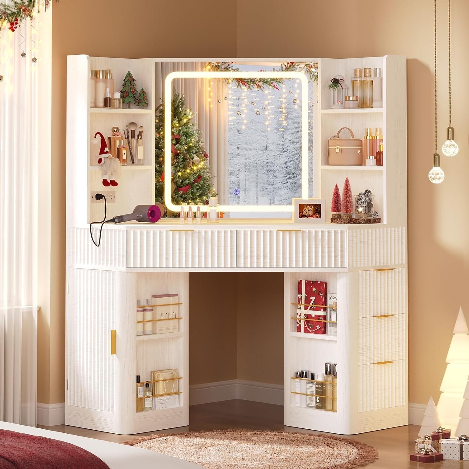 Corner Vanity Desk with Lighted Mirror Drawers Shelves Storage Stool