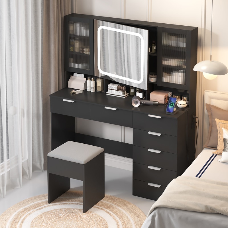 55.1" LED Makeup Vanity Table with Mirror and Stool, Storage Drawers and Organizers
