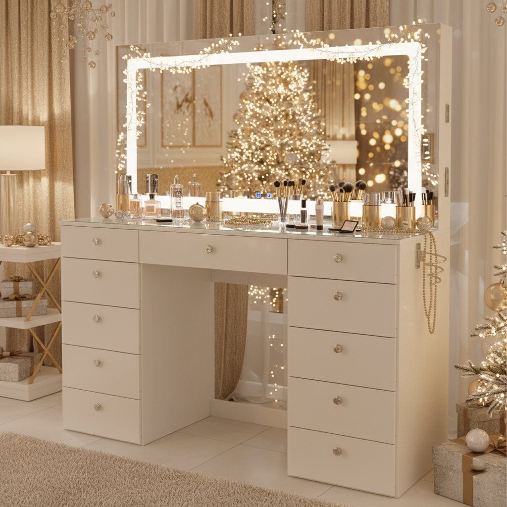 Extra-Large Vanity Desk with LED Mirror, Bluetooth Speakers, 11 Drawers and USB Ports