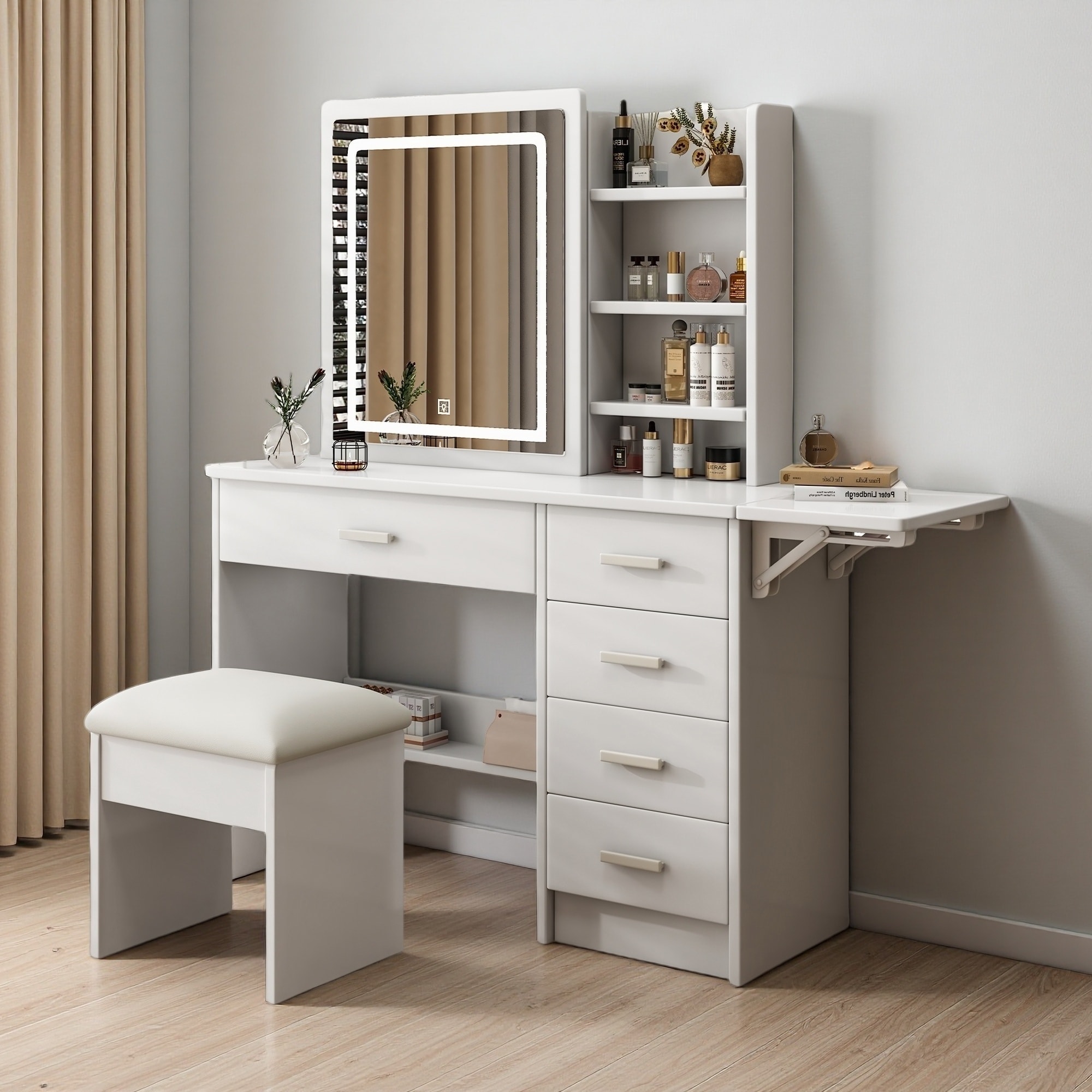 Modern 3 Colors LED Makeup Vanity Desk with Mirror, 4 Drawers and Stool