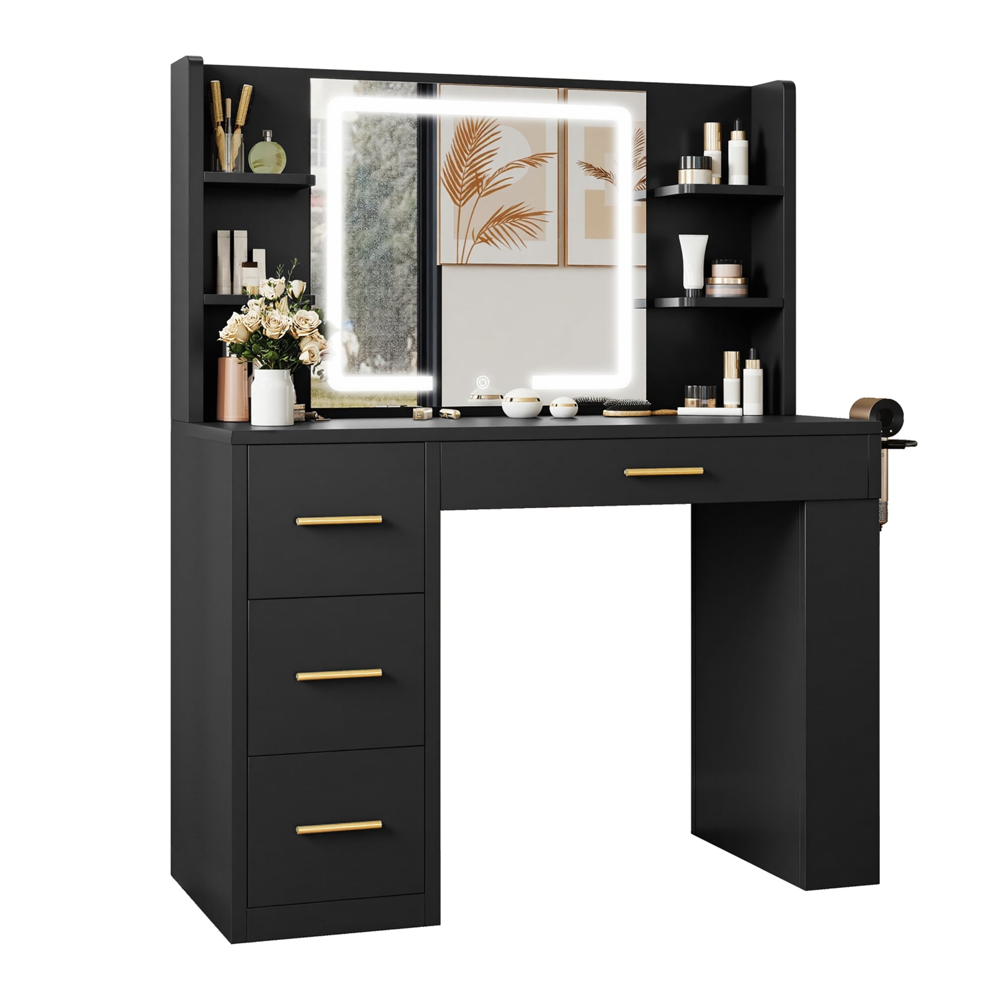 Vanity Desk with Mirror and LED Light Strip,Dressing Table with Large Drawer, 3 Level Storage Dresser & Adjustable Brightness
