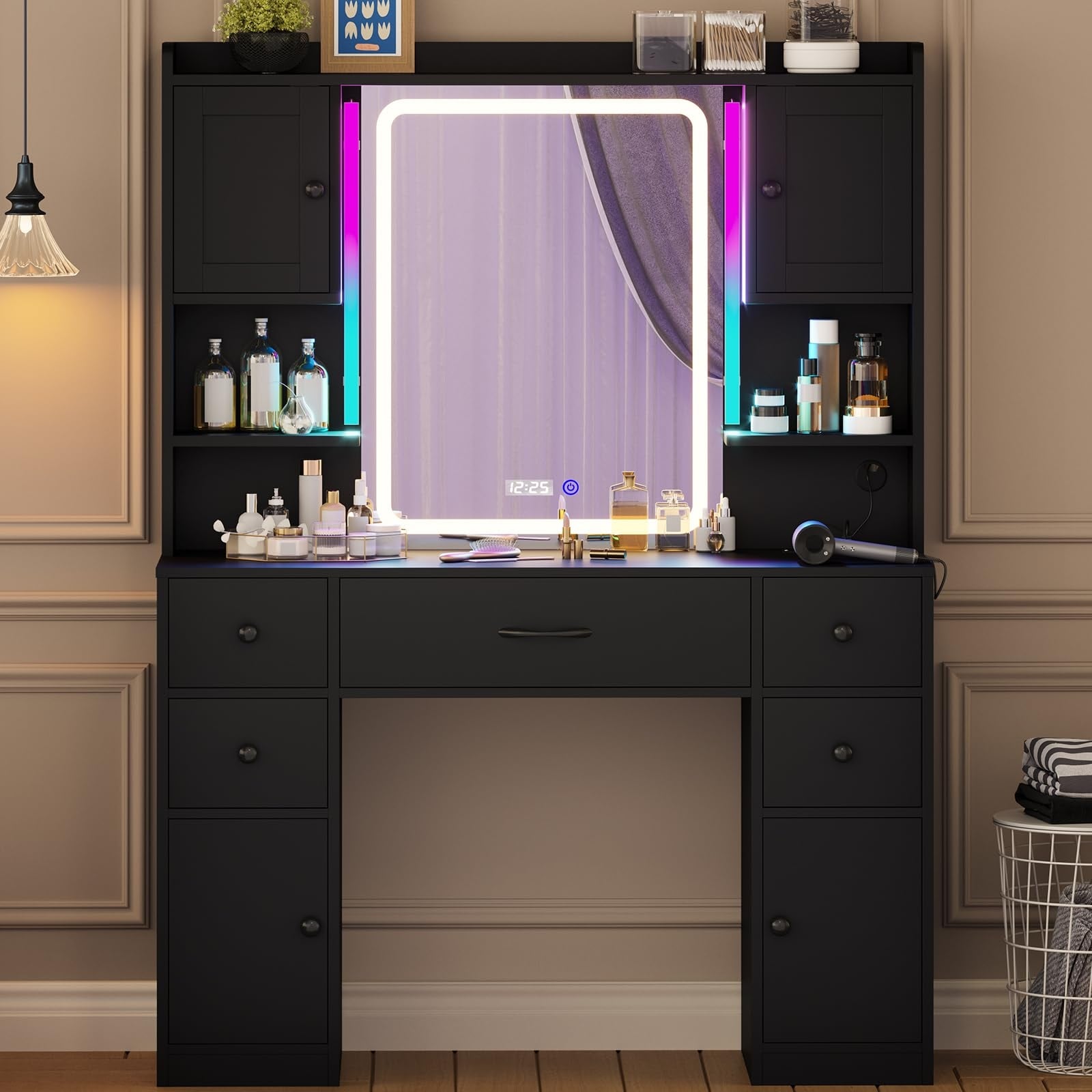 Large Vanity Desk with Mirror and Lights, Makeup Vanity with Lights and Charging Station, Vanity Makeup Table with 5 Drawers