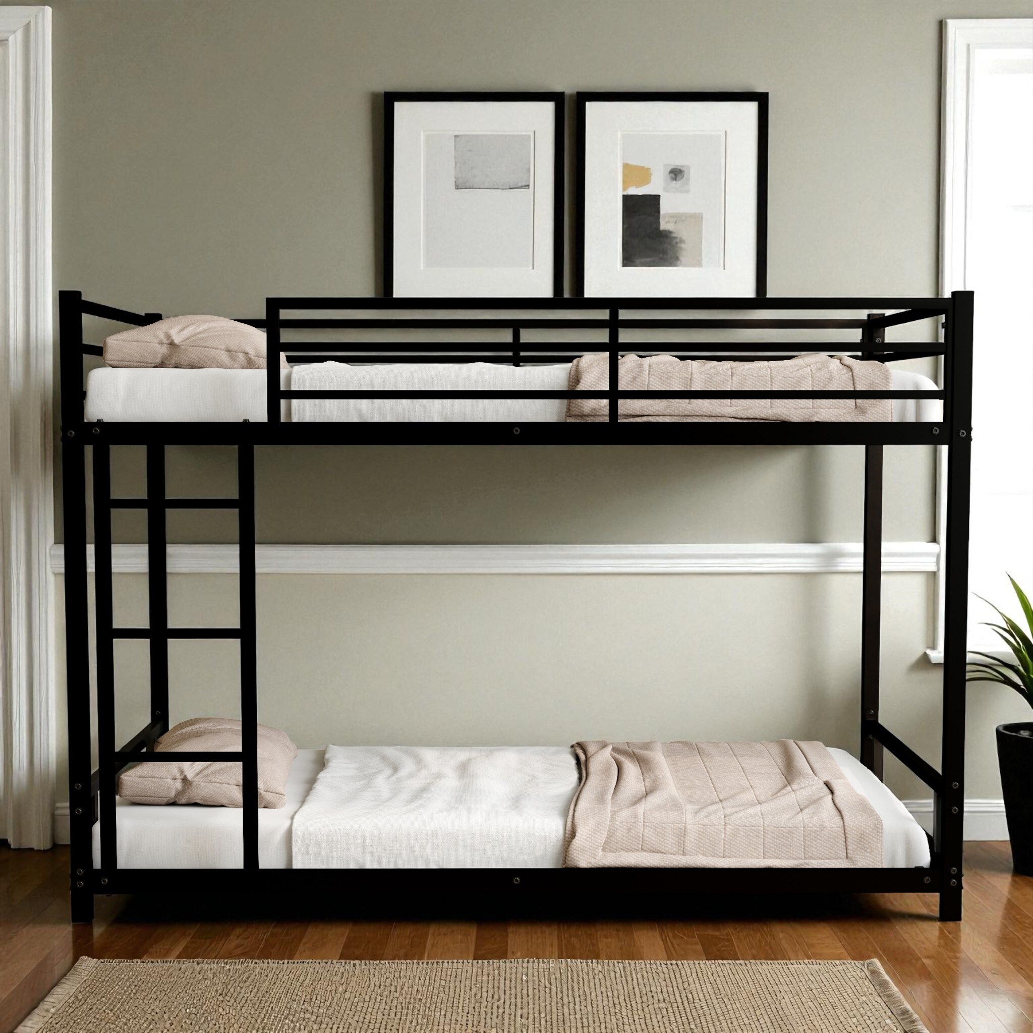 Twin Over Twin Metal Bunk Bed with Guardrails and Convertible Frame, Heavy-Duty Platform with Slat Support for Kids Room