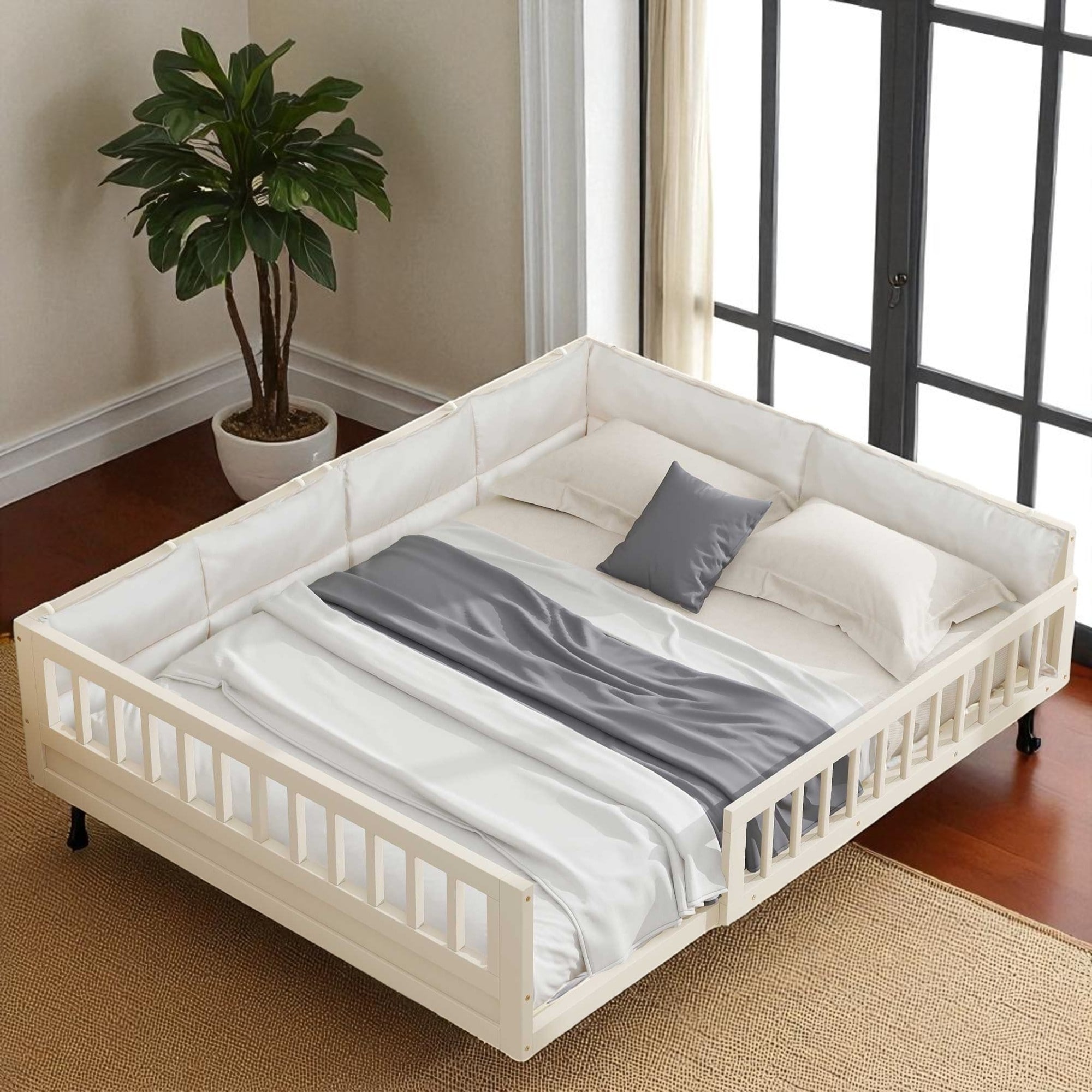 Full Size Upholstered Wood Platform Bed with Guardrails and Attached Pillow, No Box Spring Needed