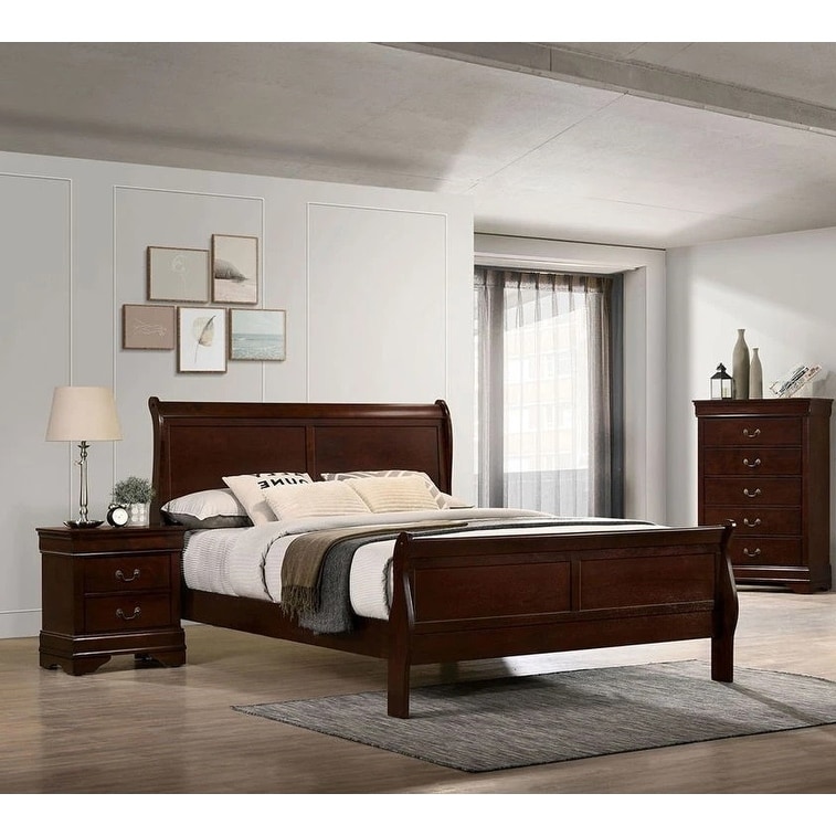 Full Size Sleigh Bed in Cherry Finish, Transitional Style Solid Wood Bedroom Furniture