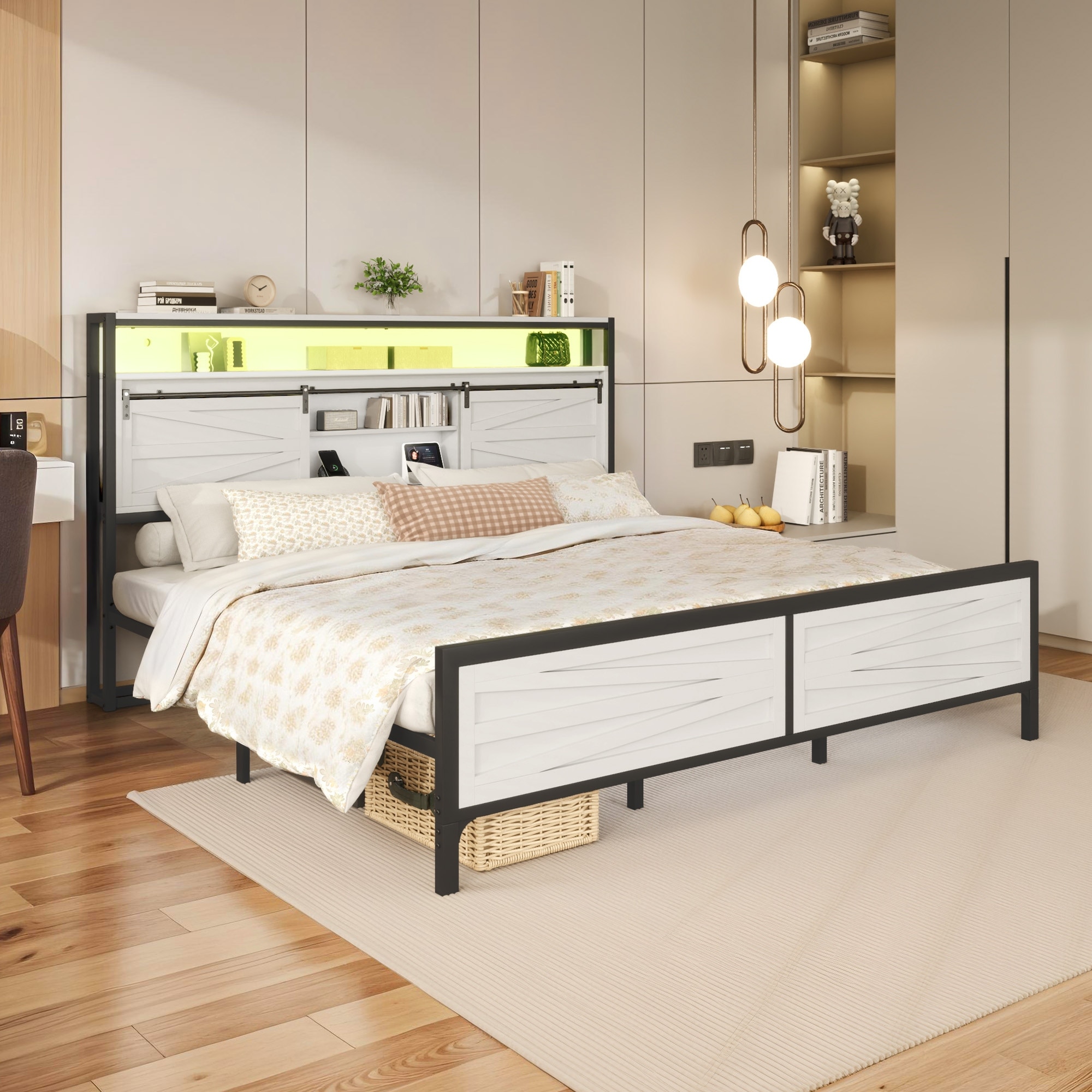 LED King Bed Frame with Charging Station, Platform Metal Headboard Storage & USB Ports Outlets, Farmhouse Lights