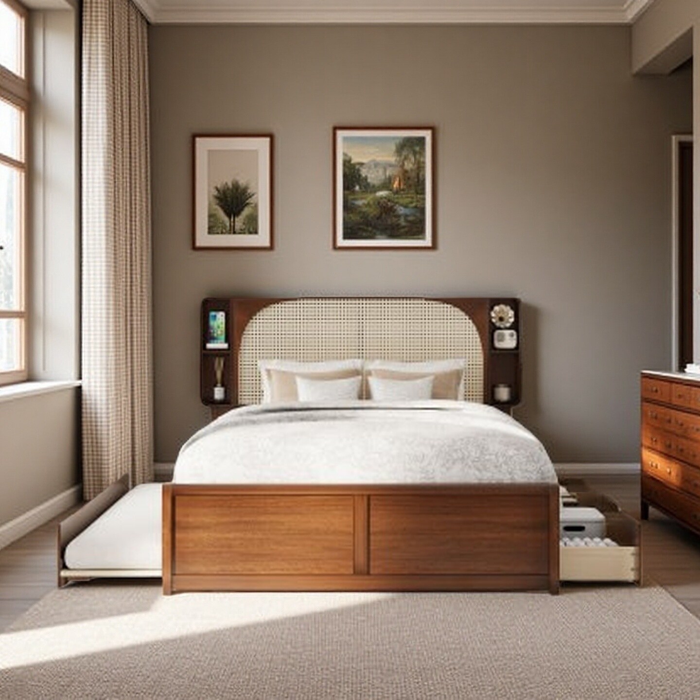 Queen Platform Bed with Rattan Headboard, 2 Storage Drawers and Pull-Out Trundle, with Built-In Compartments