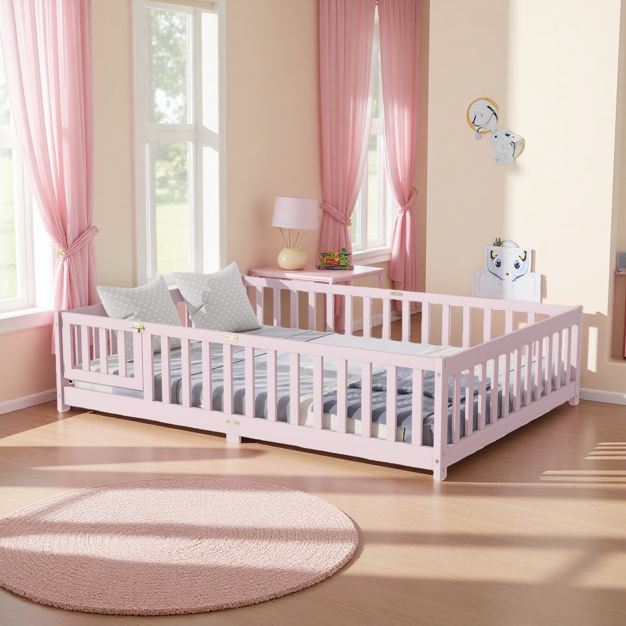 Full Size Floor Bed with Fence & Door, Rubber Wood