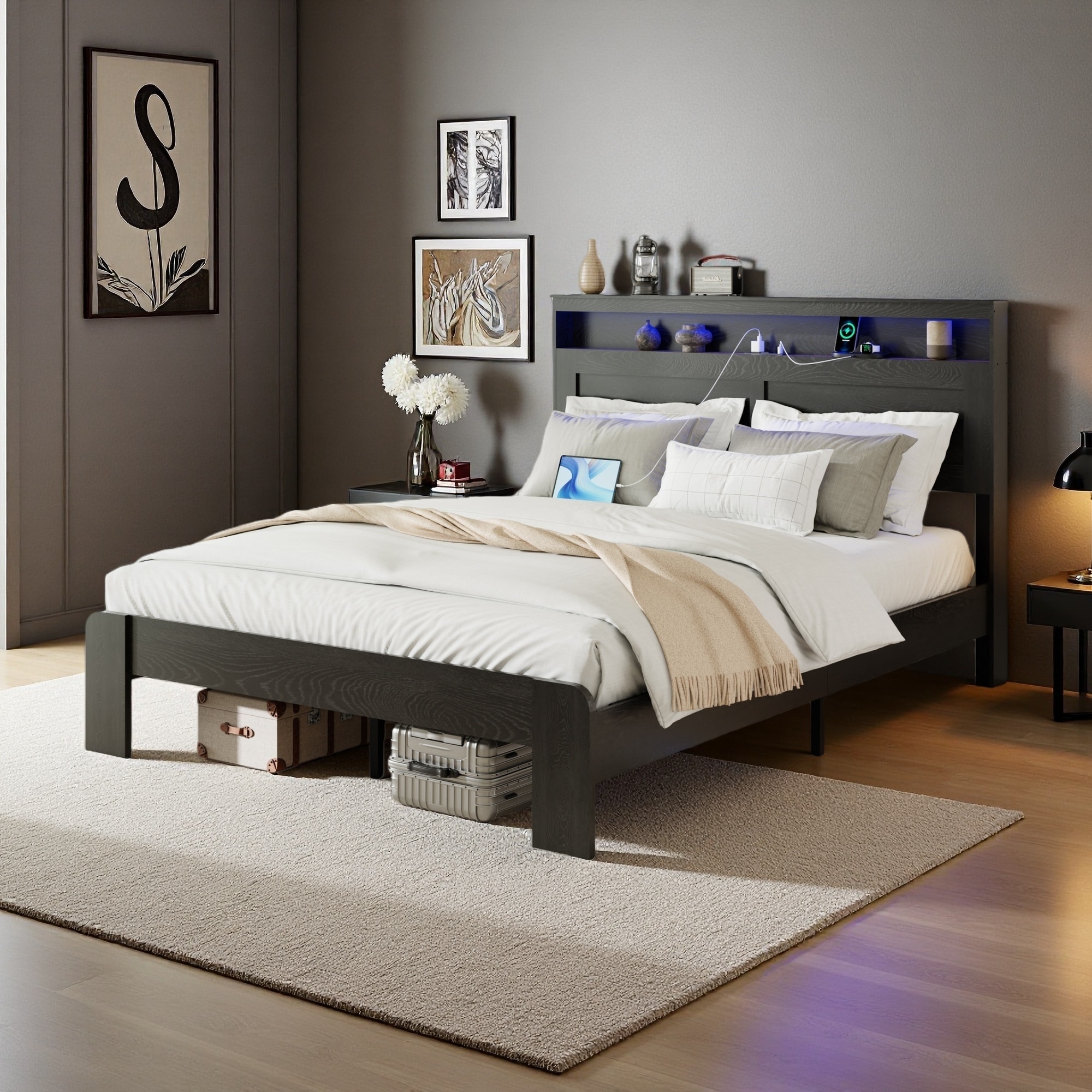 King Size Wood Platform Bed with LED Storage Headboard & USB
