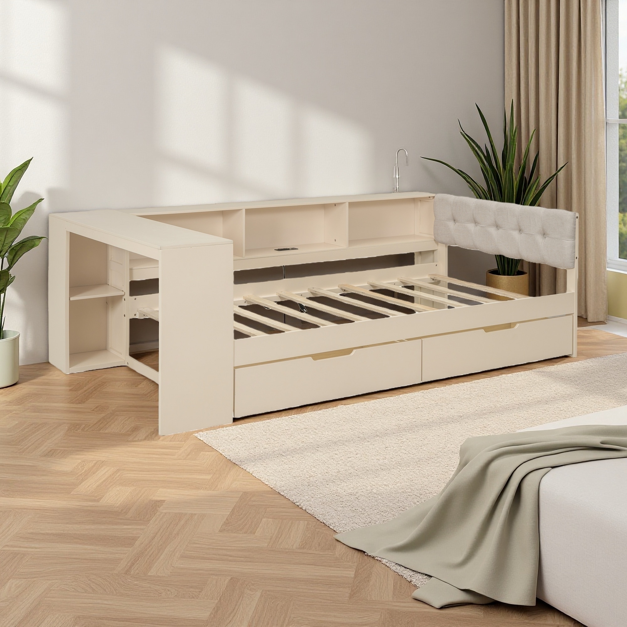 Full Size L-Shaped Daybed with Desk, Bookshelf, Cabinets & Drawers, Multi-Functional Wood Bed with Storage for Kids or Teens