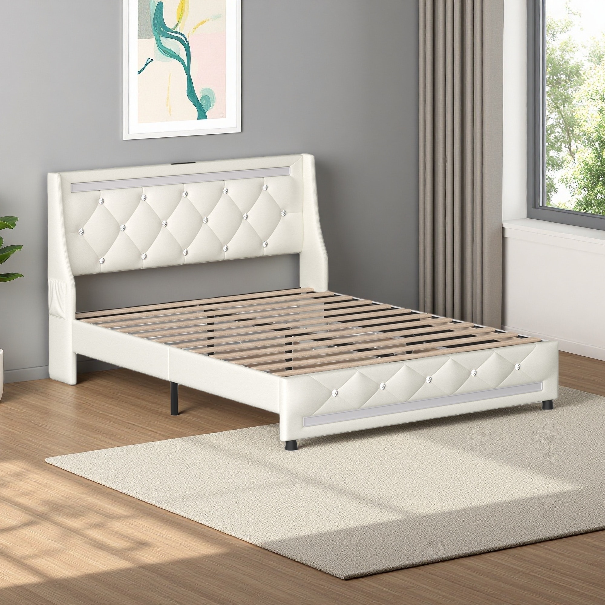 Full Size Platform Bed with Headboard Upholstered with Charging Station, LED Lights, Mattress Foundation with Wooden Slats