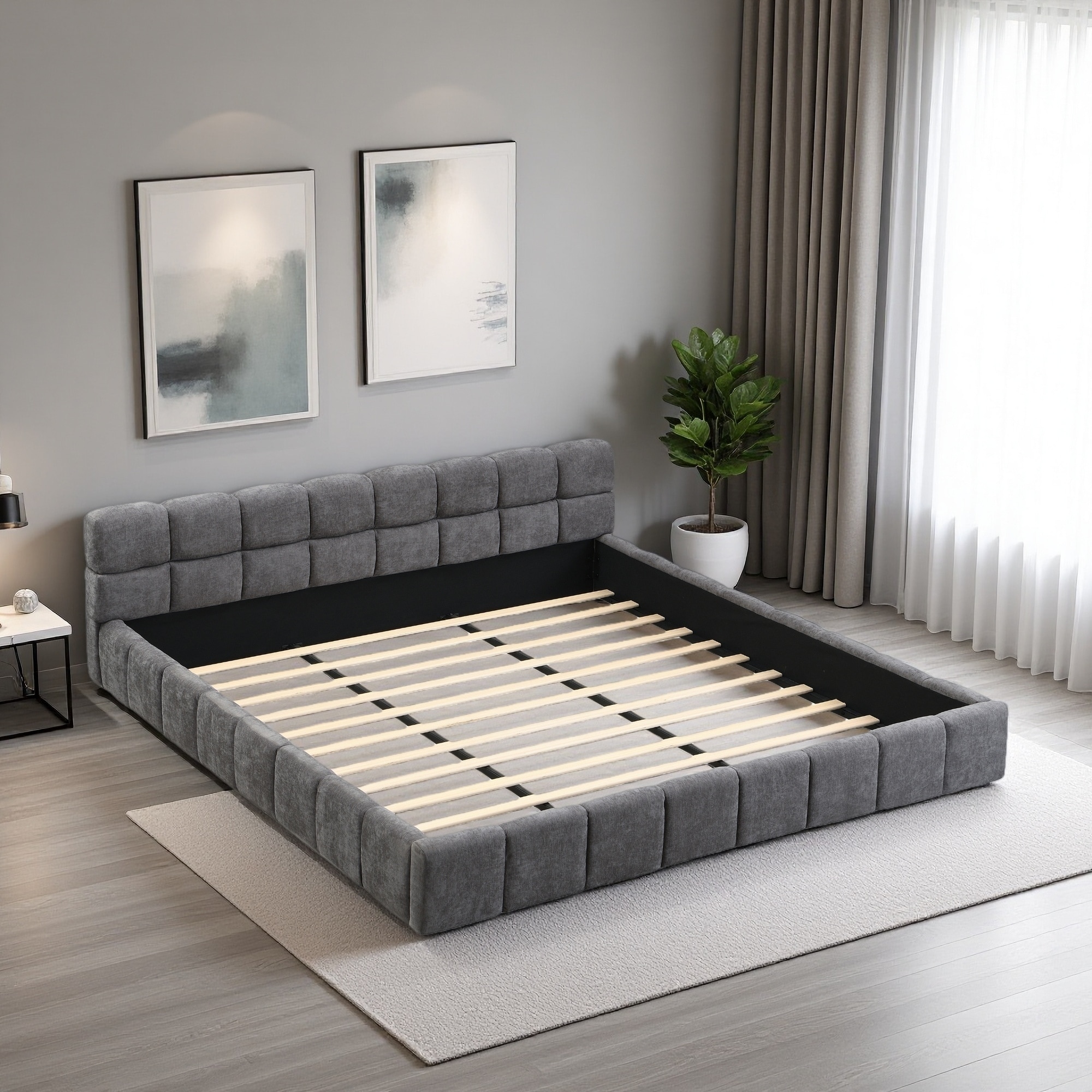 King Size Chenille Upholstered Bed with Checkerboard Headboard, Plush Texture, Timeless Design & Support for Modern Bedrooms