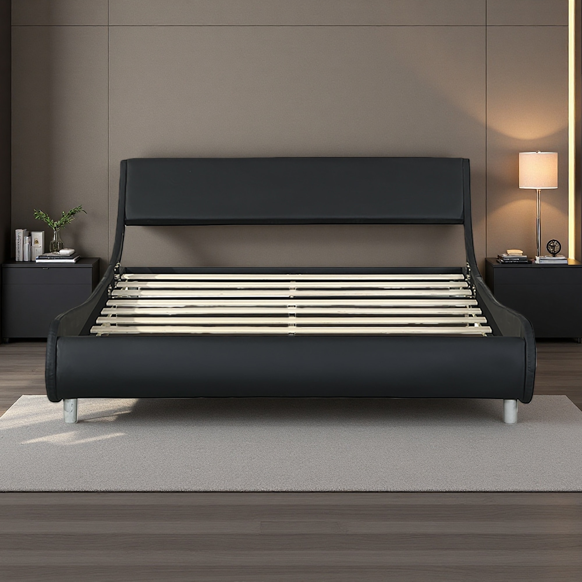 Queen Size Faux Leather Upholstered Platform Bed Frame with LED Lighting, Remote & App Control, Curve Design, Wood Slat Support